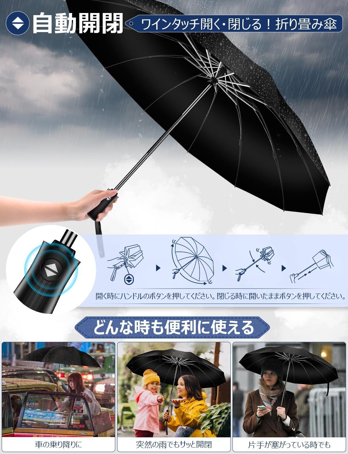 急な雨の際にあると便利な「折りたたみ傘」。【ワンタッチ自動開閉&片手で楽!】業界最新な技術を採用されています、ボタンを押すだけで傘を開いたり閉じたりできます。片手でも簡単に開閉できます。傘を閉じる時に撥ねてくる雨粒で袖が濡れる気まずさにさようなら!突然雨が降り出したけど、傘を開くのに手間取り濡れてしまったという経験がある人も多いのではないでしょうか。ワンタッチ自動開閉式なので、スピーディに開けられます。雨の日の車の乗り降り、子供を抱きかかえている時や荷物の多いときも楽です。外回りの仕事、突然の夕立にもサッと広げる事が出来、いつでも安心しています。(ご注意:密封することにより少し折りたたみ傘特有のニオイがありますが、健康に影響はございませんので、安心してご使用ください。ニオイが気になる場合は風通しの良い場所に1、2日置いておくとニオイも気にならなくなります。)
