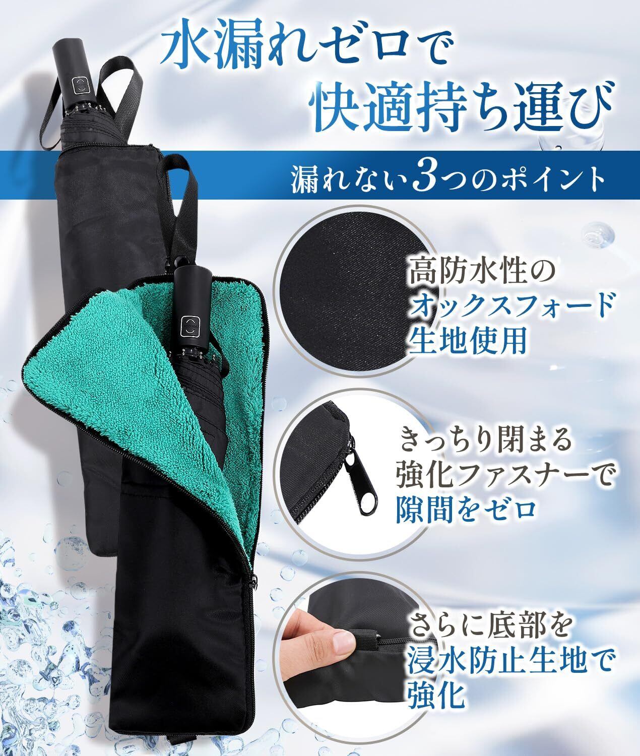 短い傘でもカバーの余った部分を折ってしまえばバッグやリュックにも簡単に入ります。底部分も強化していますので、バッグの中に傘を縦に入れても水がしたたり出ることがありません。強化止水ファスナーを使っていますので傘の水滴を外に漏らすことがありません。