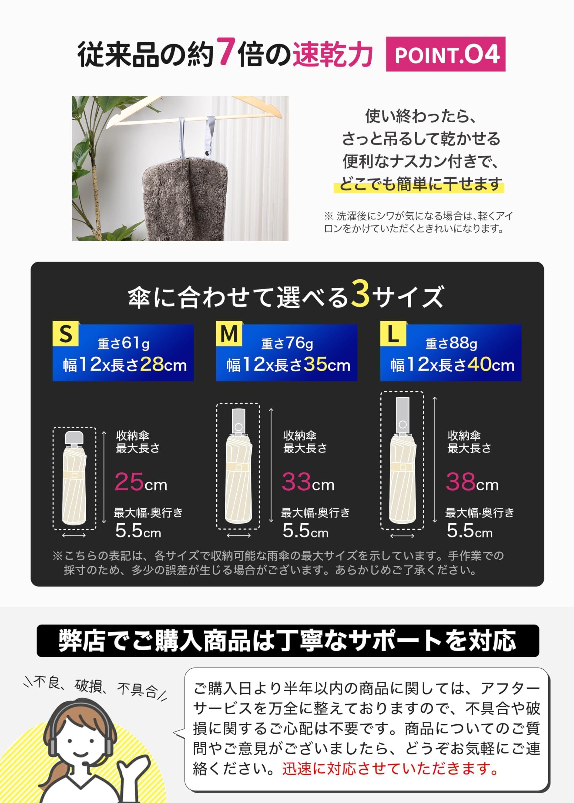 【3サイズ×8カラー・お好みに合わせて】Sサイズ:約28×11cm;Mサイズ:約35×12cm;Lサイズ:約40×13cm。3サイズの傘カバーをご用意しました。大きめの折りたたみ傘にも対応しているので、安心してお使いいただけます。さらに、8色をご用意しており、年齢や性別を問わず、きっとお気に入りが見つかります