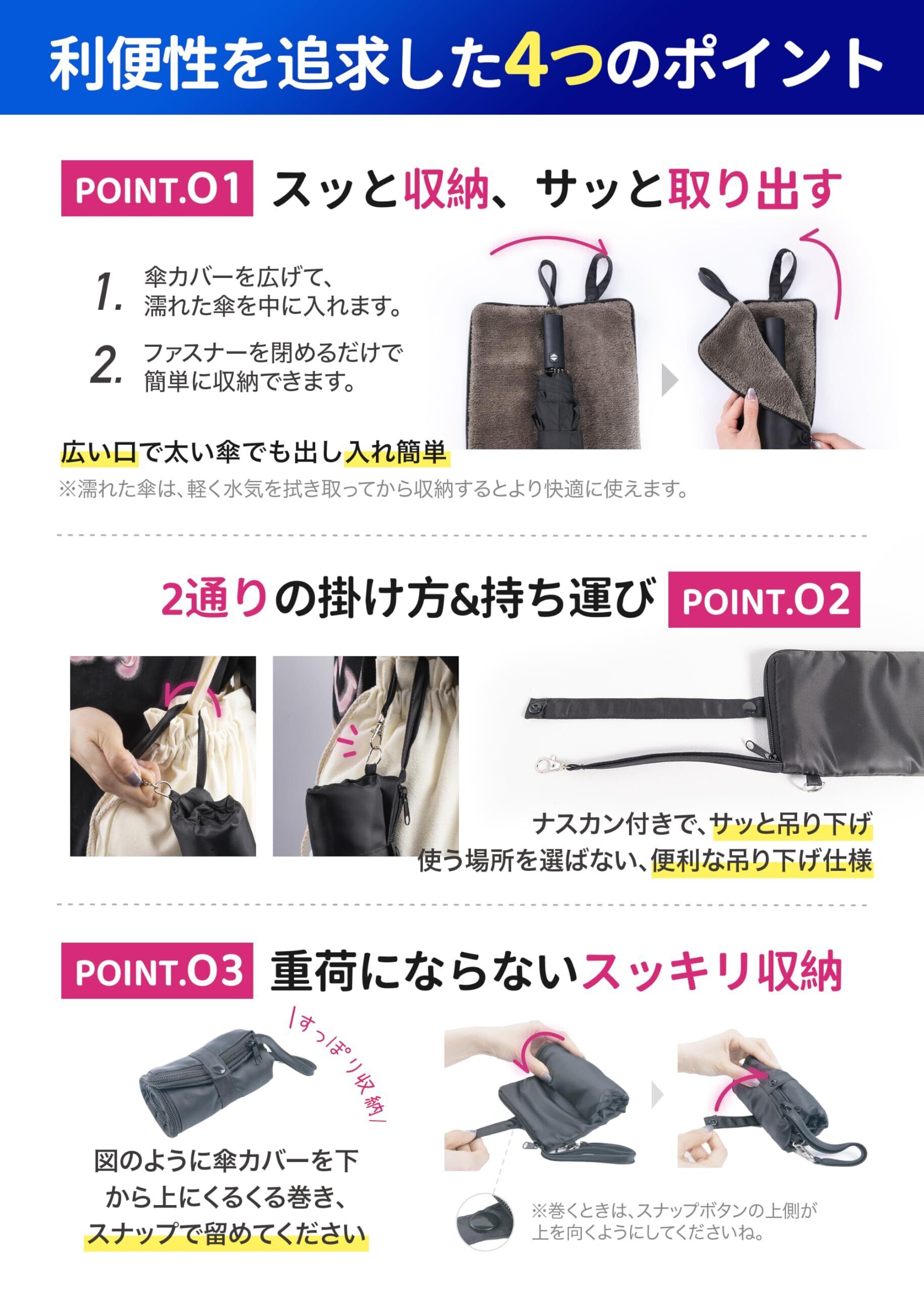 【多用途・自由に使用】雨の日の通勤や通学に最適な便利なアイテムです。電車内やオフィスなど公共の場でも、濡れた傘の取り扱いに悩むことなくスマートに使用できます。さらに、冷たいペットボトルや小物の収納としても活用可能です。傘カバーを広げれば、吸水速乾性に優れた素材で水滴をさっと拭き取れるため、タオル代わりとしても便利です。ひとつ持っておくと重宝する実用グッズです