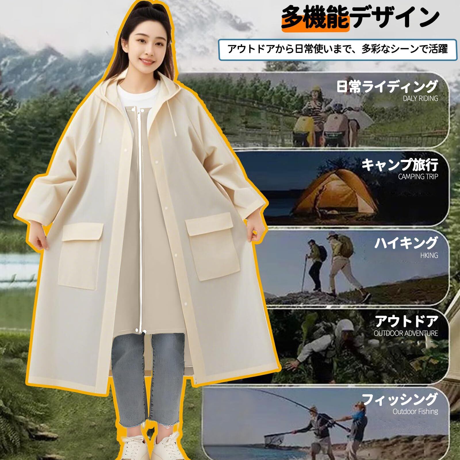 【便利な機能が満載】①レインコートの背中に反射テープ付き、車などからの視認性が高まり、視界が悪い雨の夜間でも安全性アップ。②フードはロープ付きで調節可能、袖口はゴム入り、雨風の侵入を防ぎ、自転車やバイク運転時や雨天の作業時にとても便利。③フラップ付きのポケットが2つあり、ちょっとした小物の収納に実用的。④リュック対応 雨の日の自転車で、機能もおしゃれも妥協したくない人のための、高い機能性とデザイン性を両立させたレインコートです。