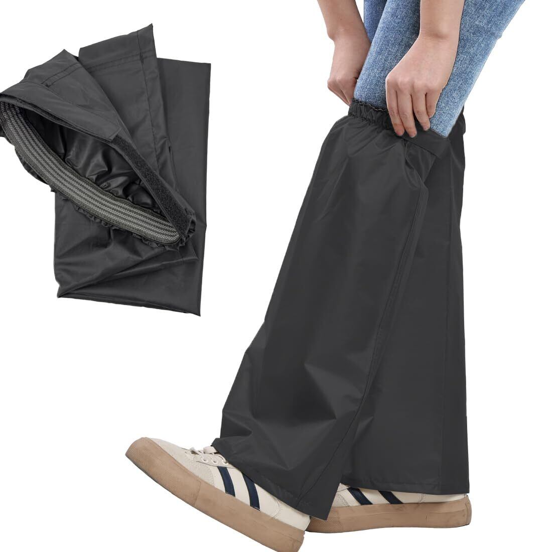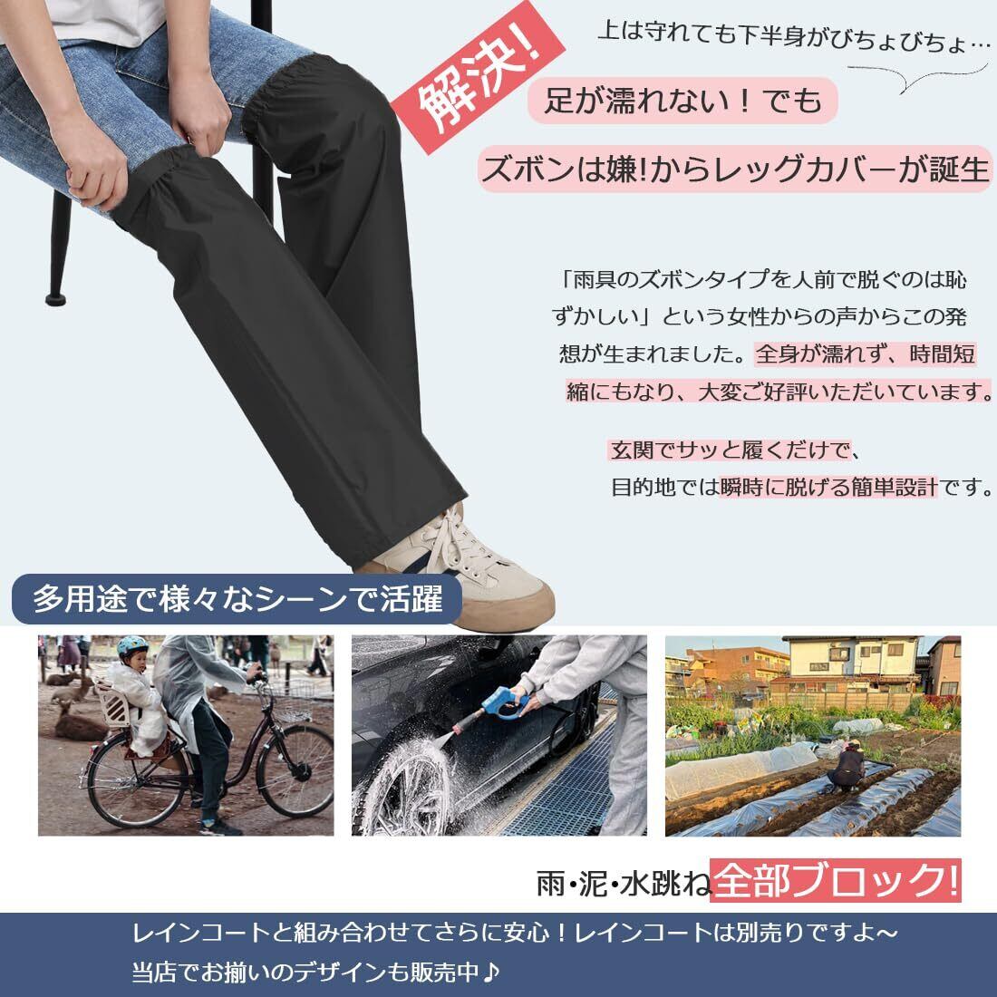 【防水・撥水性能に優れ、足元をしっかり守る】このレッグカバーは、100%高品質ポリエステル素材を使用しており、卓越した防水・撥水機能を持っています。雨や泥の汚れを確実に防ぎ、足を濡れさせません。梅雨の通勤時や野外フェスで楽しむときも、足の濡れを心配する必要がなく、快適な時間を満喫できます。