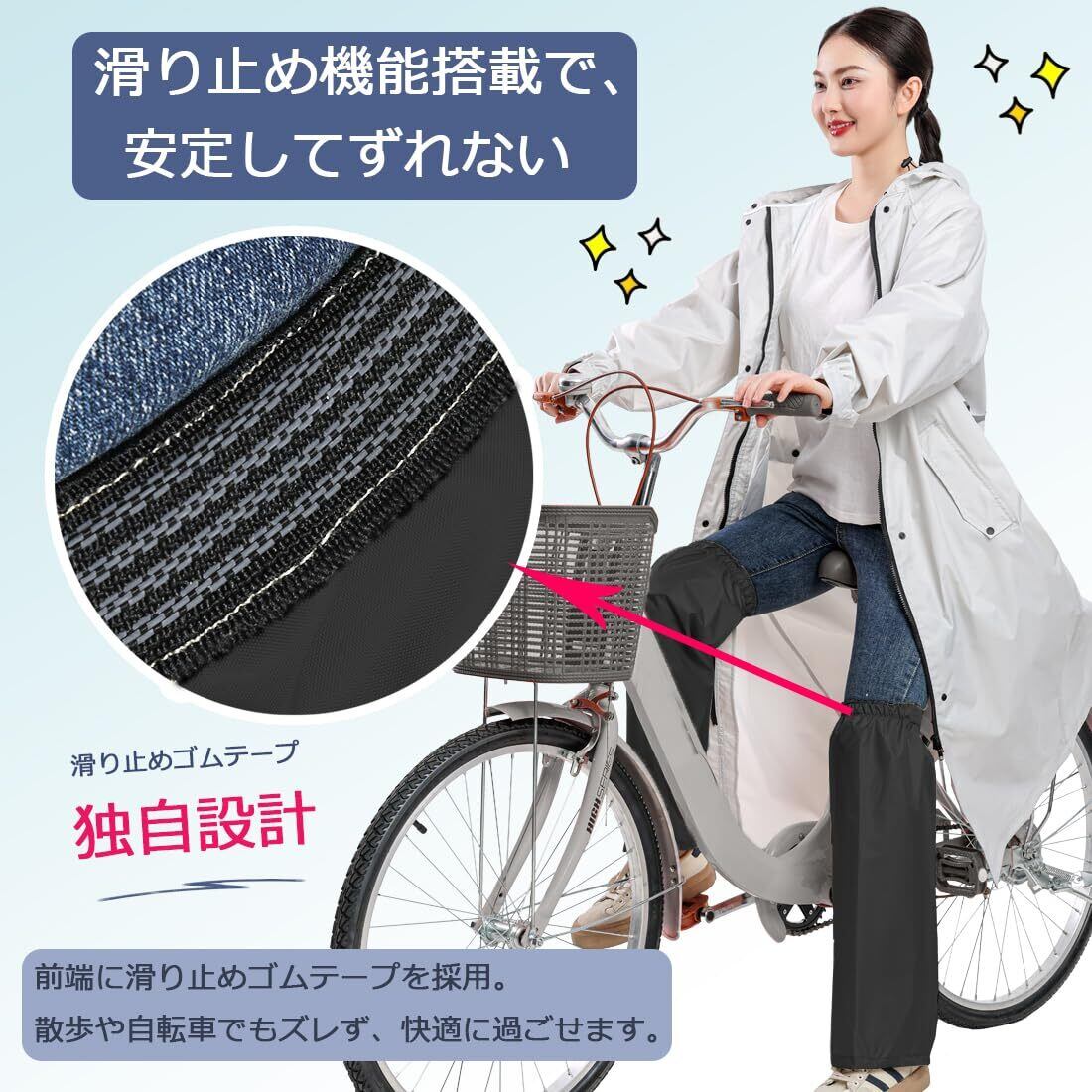 【滑り止め機能搭載で、常に安定した装着感】防雨レッグカバーの前端には、細やかな配慮の上、滑り止めゴムテープが施されています。普段の散歩や自転車での移動中でも、レッグカバーがズレたりめくれたりすることはありません。優れた滑り止め性能によって、着用中ずっとしっかりと足に固定され、様々なシーンで安心して使えます。滑落の不安を全く感じず、快適に過ごせます。
