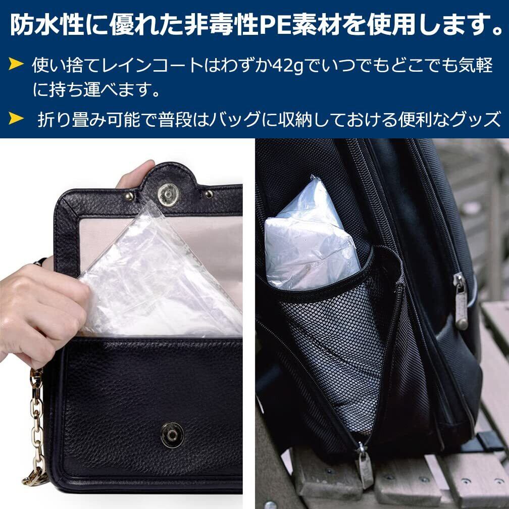 【持ち便利】折り畳み可能で普段はポケットやバッグ等に収納しておけるので持ち便利です。梅雨の時期はもちろん、イベント時の急な雨、秋の台風シーズンまで普段使いのバッグの中に常備しておきたい使い捨てレインコートです。旅行バッグやトランクの中に入れておけば、予測のつかない旅先の天候変化も気にせず過ごせます。