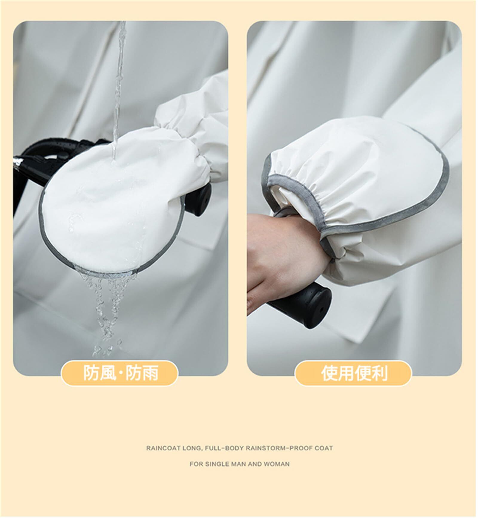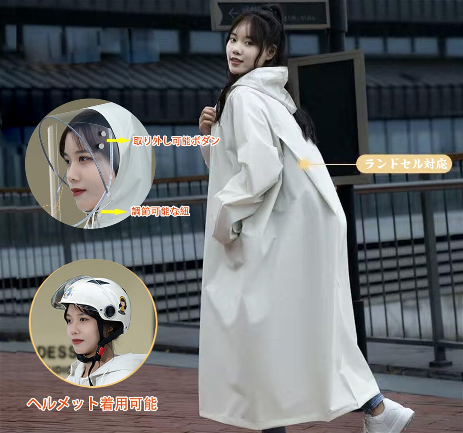 【レインコート レディース ロング】自転車、リュックに対応可能な男女兼用のレインコート。膝下までカバーするロング丈、体がしっかり覆われ、レインブーツを履けば足元まで濡れない、全身を雨から守ることができます。