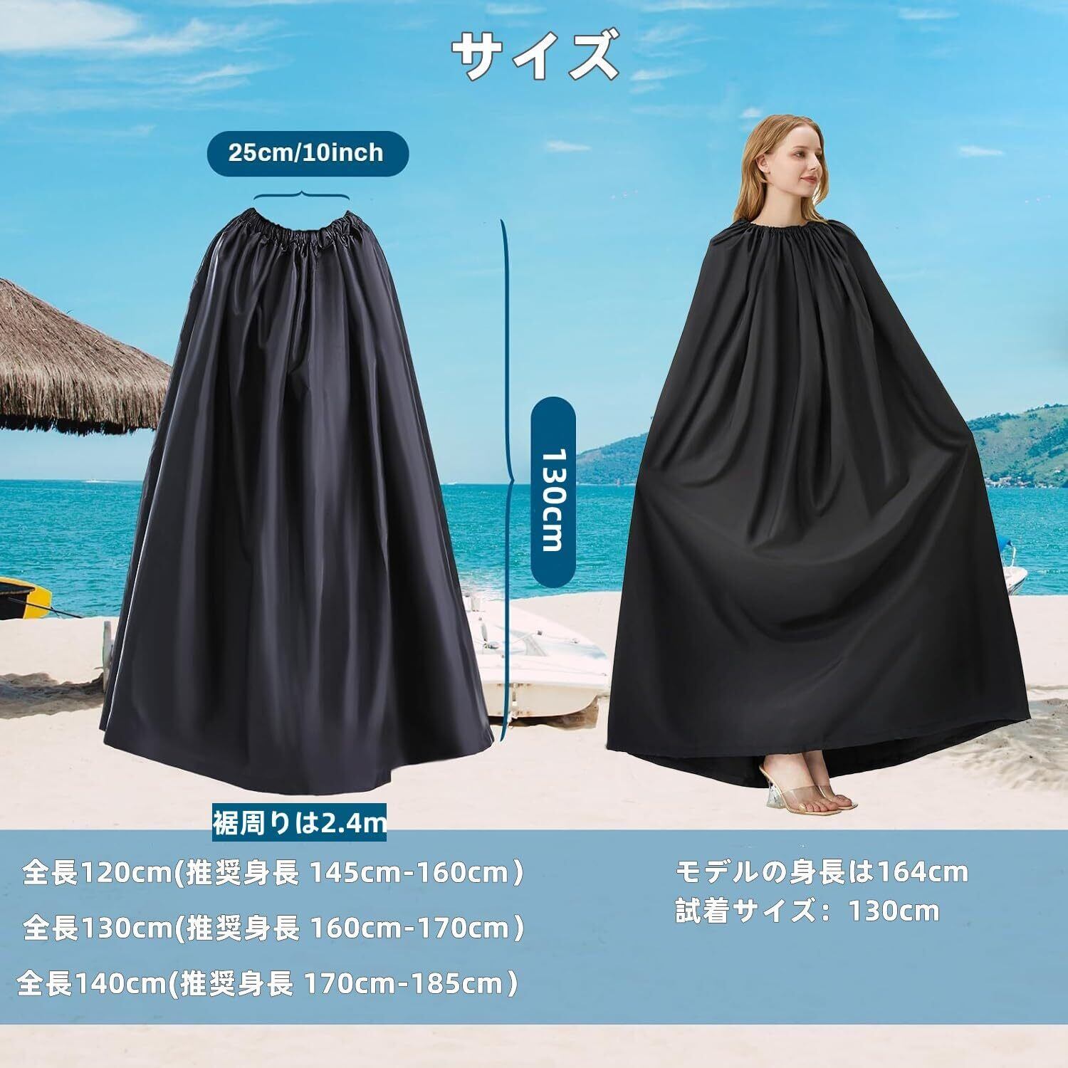 【サイズ&広い空間】この目かくし用ポンチョには3つのサイズがあります。全長120cm(推奨身長 145cm-160cm)、全長130cm(推奨身長 160cm-170cm)、全長140cm(推奨身長 170cm-185cm)、男女兼用。広々と着替えが出来ますよ小柄女性から大柄男性まで網羅着替え空間を最大化!