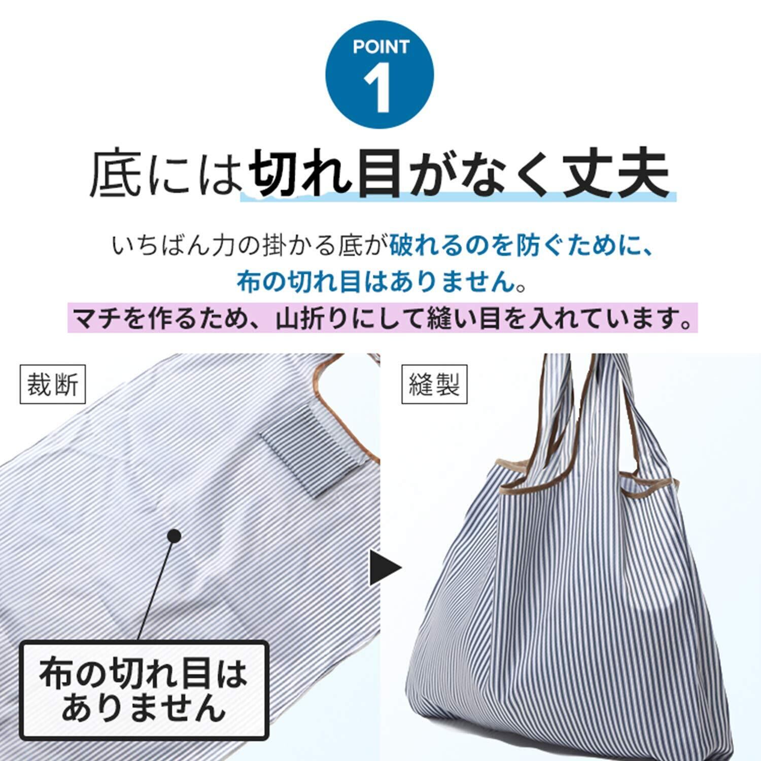 底に生地の切れ目が無い一枚物の生地で作ってりますので、1番力の掛かる底が破れる心配がありません。マチを作る工程にて、必要となるため、縫い目は有りますが、切れ目は無いです。