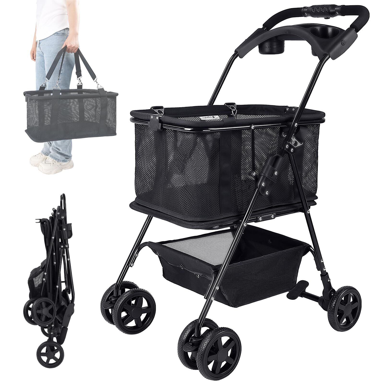 【数量限定】ショッピングカート ワンタッチ 折りたたみ 買い物カート 2段 コンパクト収納 静音 軽量 キャリー カゴ 取り外し 4輪 ブレーキ付き スーパー 買い物かご エコバッグ 大容量(ブラック・メッシュ)