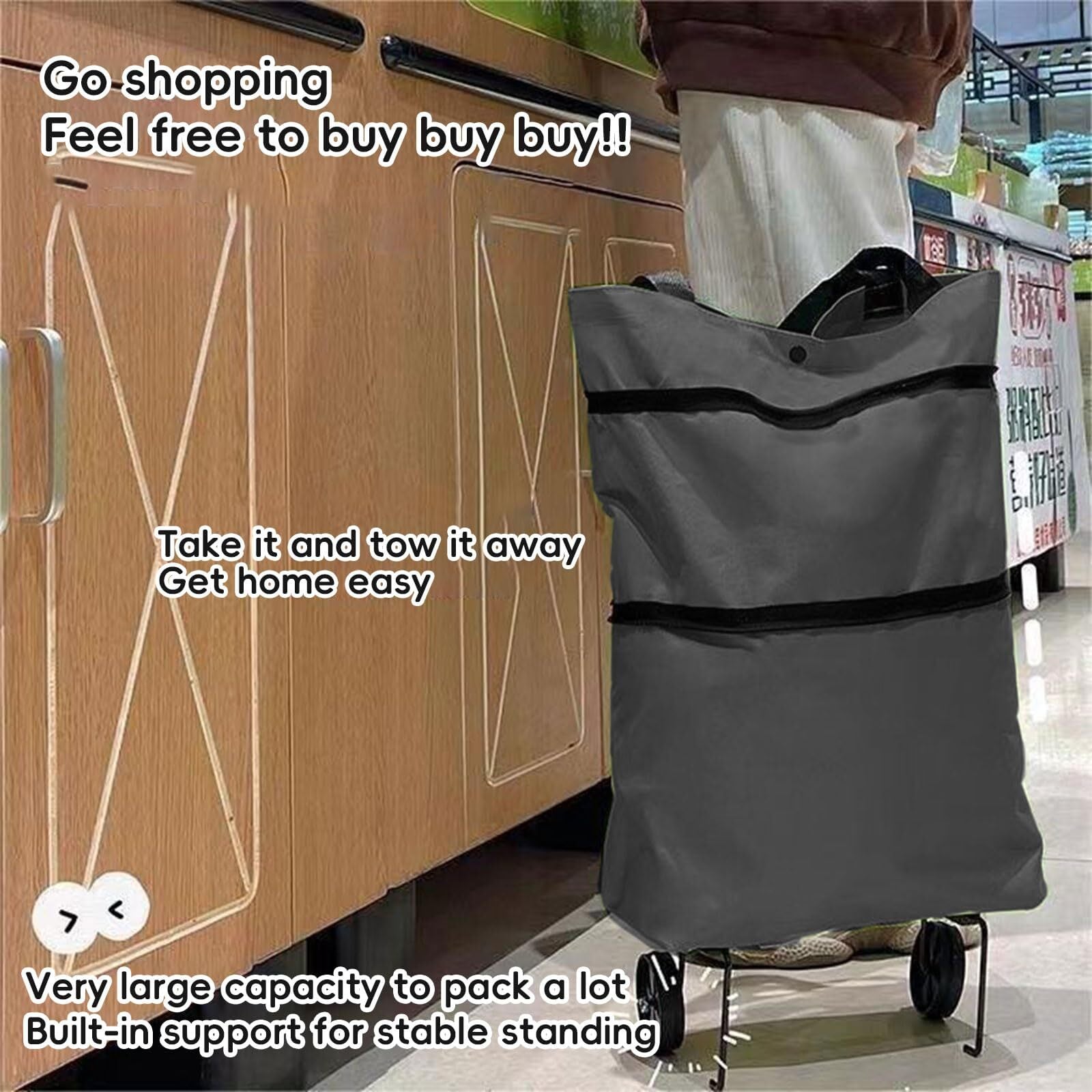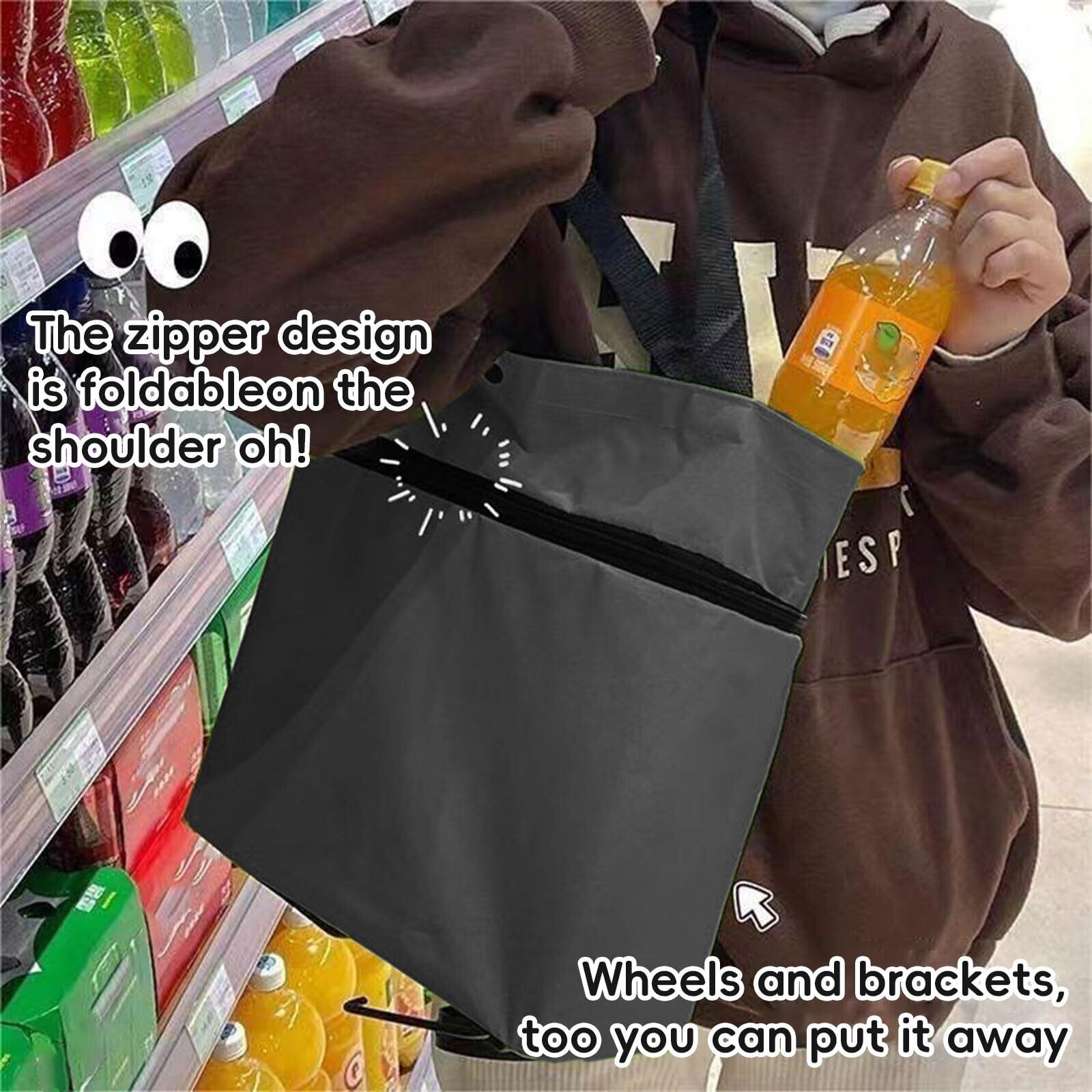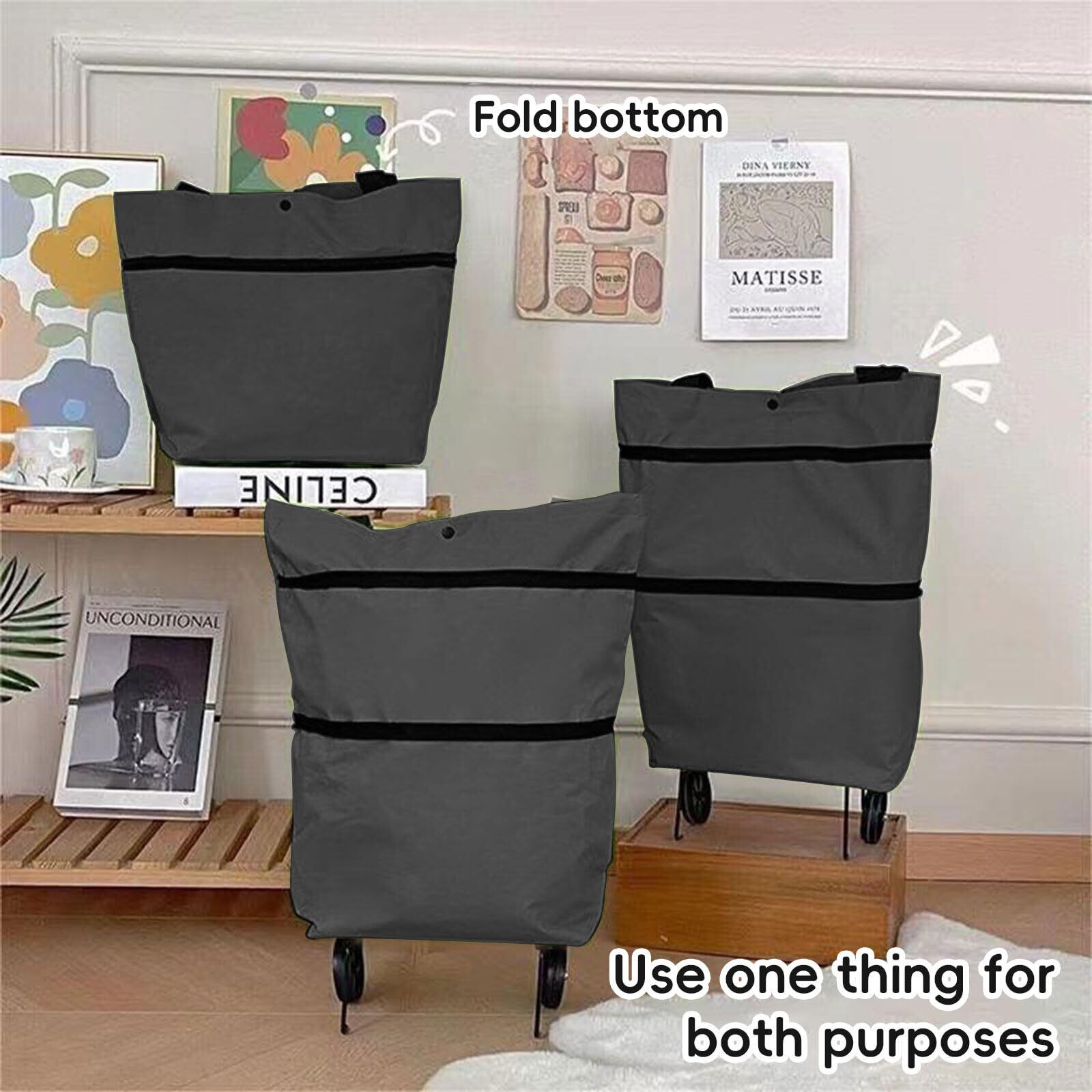 【折りたたみ簡単】必要に応じてバッグ型に折りたたむことができ、持ち運びや収納に便利です。通常のショッピングバッグとして使用したり、車輪を広げてポータブルショッピングカートとして使用したりできます。