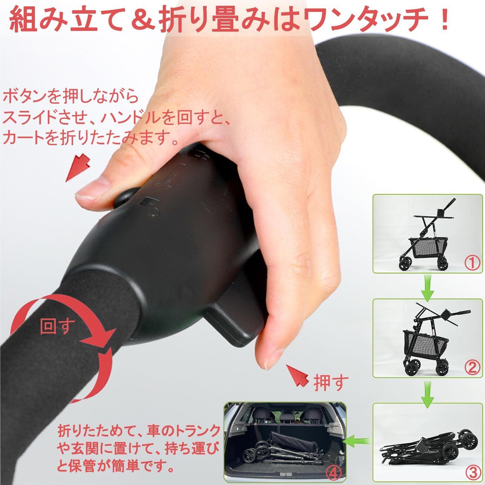 【折り畳み式買い物カート】前輪はカチッとすぐに取り付けられ、ハンドルを持ち上げると簡単に立ち上がります。手元のロック解除ボタンを押しながらハンドルを回すだけ、カートを折りたたむ事ができる。折りたたむとコンパクトになるので車のトランクや玄関にも置くことができ、持ち運びや保管が簡単です。