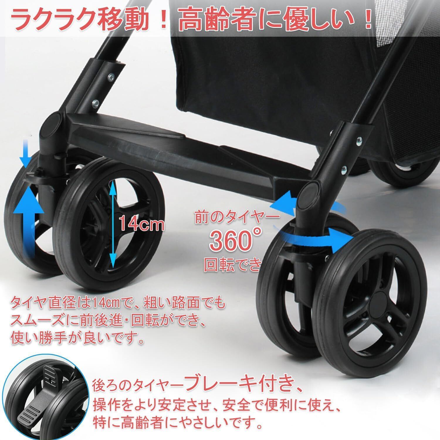 【使いやすいショッピングカート】ショッピングカートのタイヤ直径は14㎝で、大きいです。大きなタイヤにより、粗い路面でもスムーズに前後進・回転ができ、使い勝手が良いです。ブレーキ付きと四輪設計なので安定しており、転倒の心配もありません。握りやすいハンドルがしっかりと握れるように設計されており、高齢者でも扱いやすいデザインです。