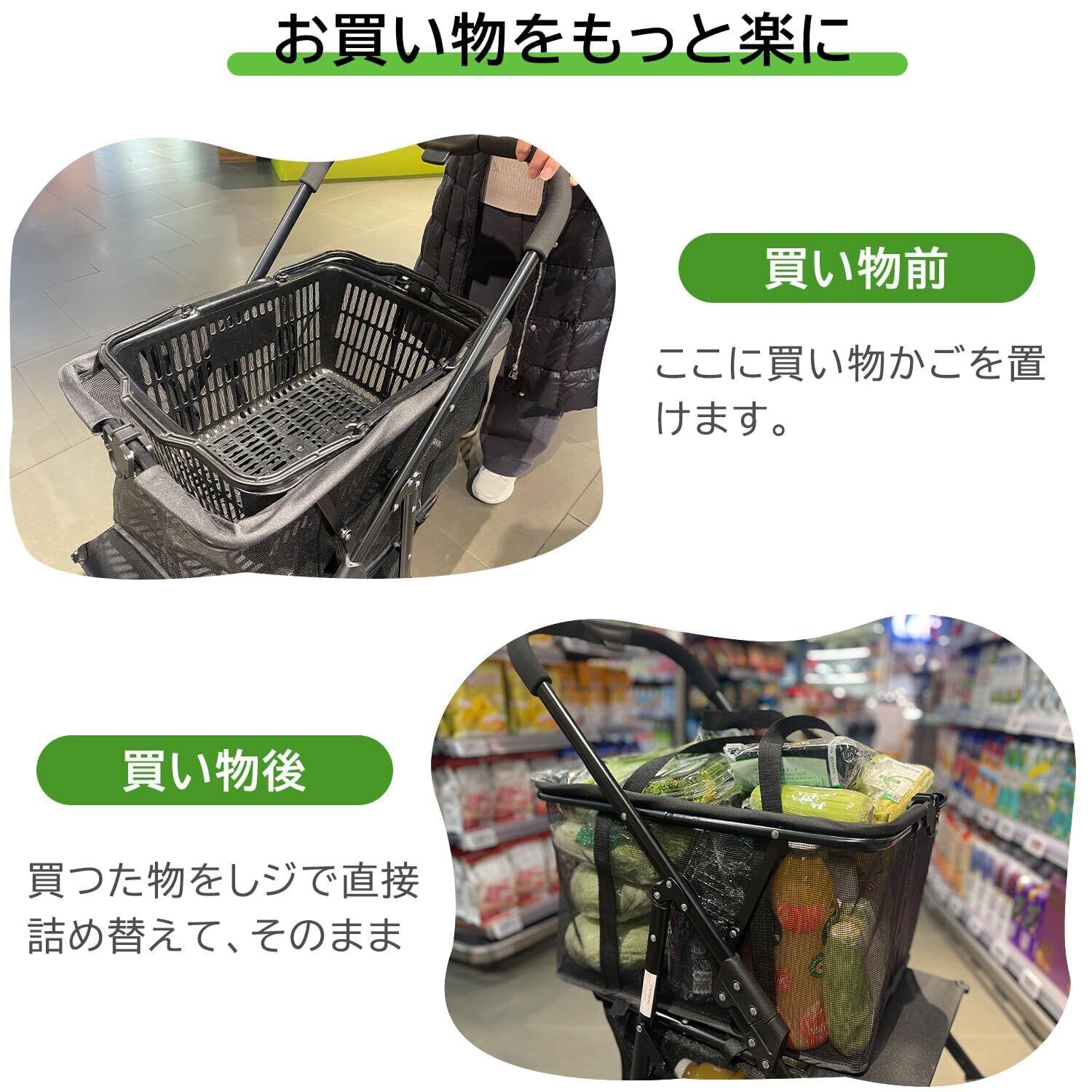 【利用場合】お買い物時に大活躍!家からスーパーまで、スーパーから駐車場まで、道中の坂道やエレベーターも。あなたはこのショッピングカートを押すだけ! そして、ほとんどのスーパーのかごがセット可能!スーパーの買い物だけではなく、ショッピング、お散歩、アウトアドの使用にも可能です。父や母などへのプレゼントはも最適です。