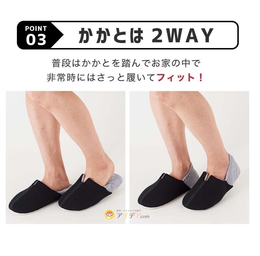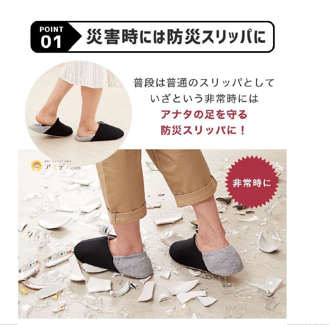 普段はスリッパとしてお使いいただき 災害時にはガラス片や釘などから足裏を守る防災スリッパに。(普段使いの時は踵を踏んでご使用いただけます。)