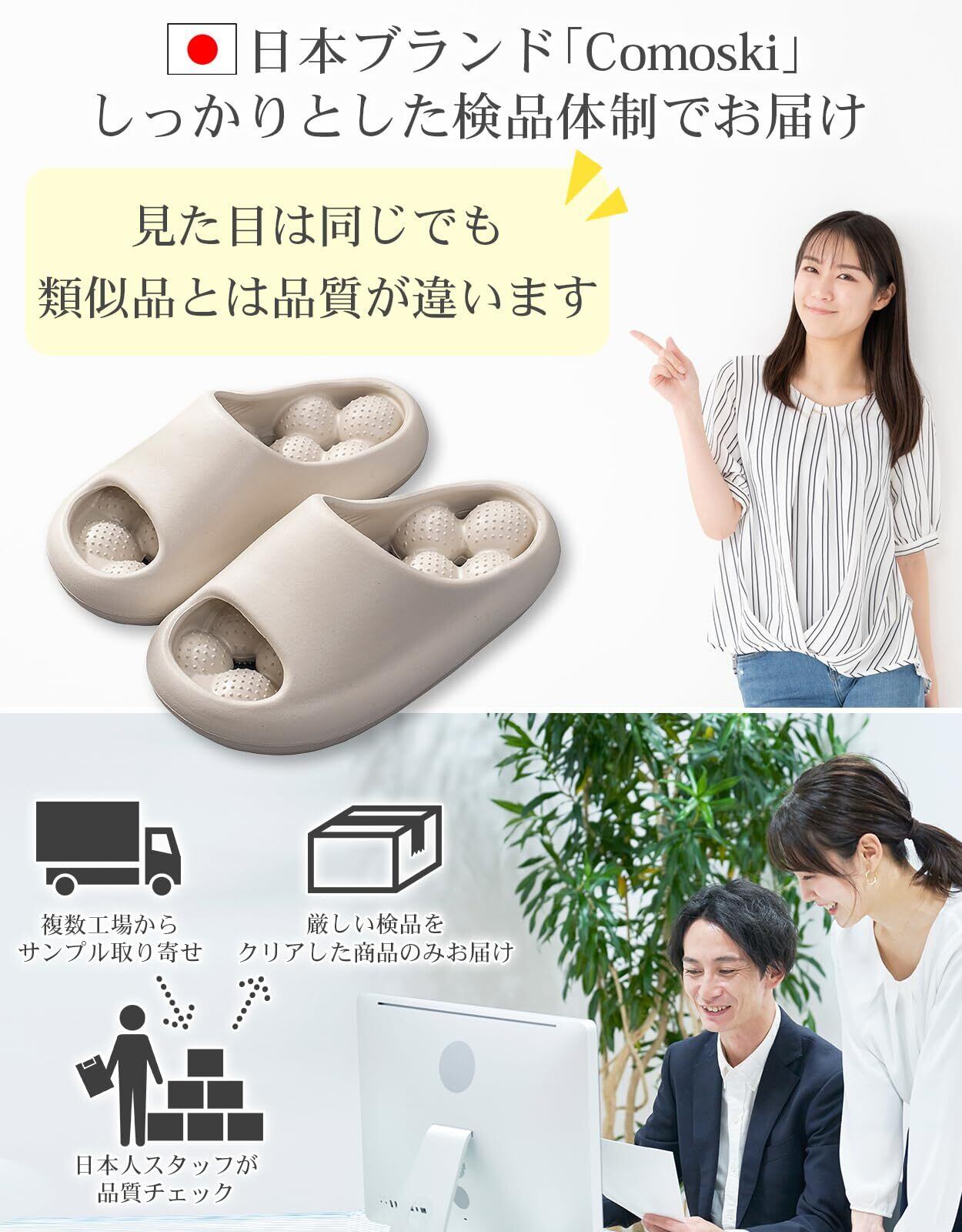 Comoskiの健康サンダルはレディース、メンズ問わず、かわいいデザインで足裏の反射区を足ツボ感覚でやさしくじんわりと刺激しあなたの健康を足元からサポートします。 強すぎない刺激とクッション性抜群の厚底のため長時間の歩行も楽々、室内のスリッパとしても使えて屋外での使用も滑り止め加工があるためとても安心です。 シンプルなデザインが◎!どんなコーディネートにも合わせやすいComoskiの健康サンダルをぜひ体感してください。 ※履き始めはサンダルを脱いだ後に床が滑ることがありますので、安全のため一度水洗いすることをおすすめいたします。使い方は室内・外履きどちらもOKです。