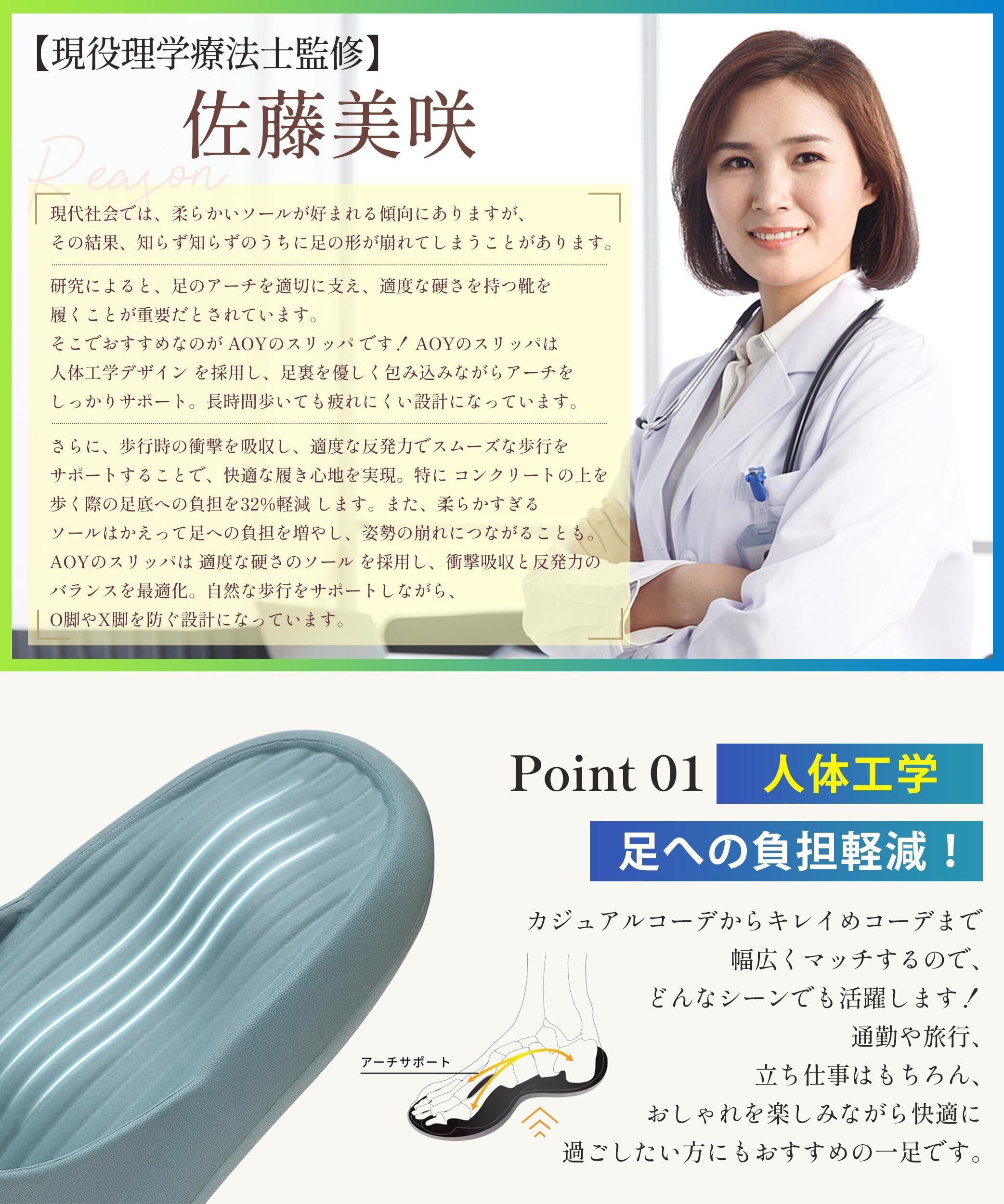 【人体工学 × 足への負担軽減!】 AOYのスリッパは足の負担を軽減するために人体工学デザインを採用しており、足裏を優しく包み込みながらアーチをしっかりサポートし、長時間歩いても疲れにくい設計になっています✨。AOYのスリッパは歩行時の衝撃をしっかり吸収し、適度な反発力でスムーズな歩行をサポートすることで、快適な履き心地を実現します。特に、AOYのスリッパはコンクリートの上を歩く際の足底への負担を、AOYのスリッパは有効に32%軽減します。また、柔らかすぎるソールは足への負担を増やし、姿勢の崩れにつながることもあって 、AOYのスリッパは適度な硬さを持つソールを採用し、衝撃吸収と反発力の最適バランス を実現すると同時に、自然な歩行をサポートし、O脚・X脚を防ぐ設計になっています✨。ご注意:金型の都合上、製品本体に若干のバリが生じる場合がございます。何卒ご了承ください。