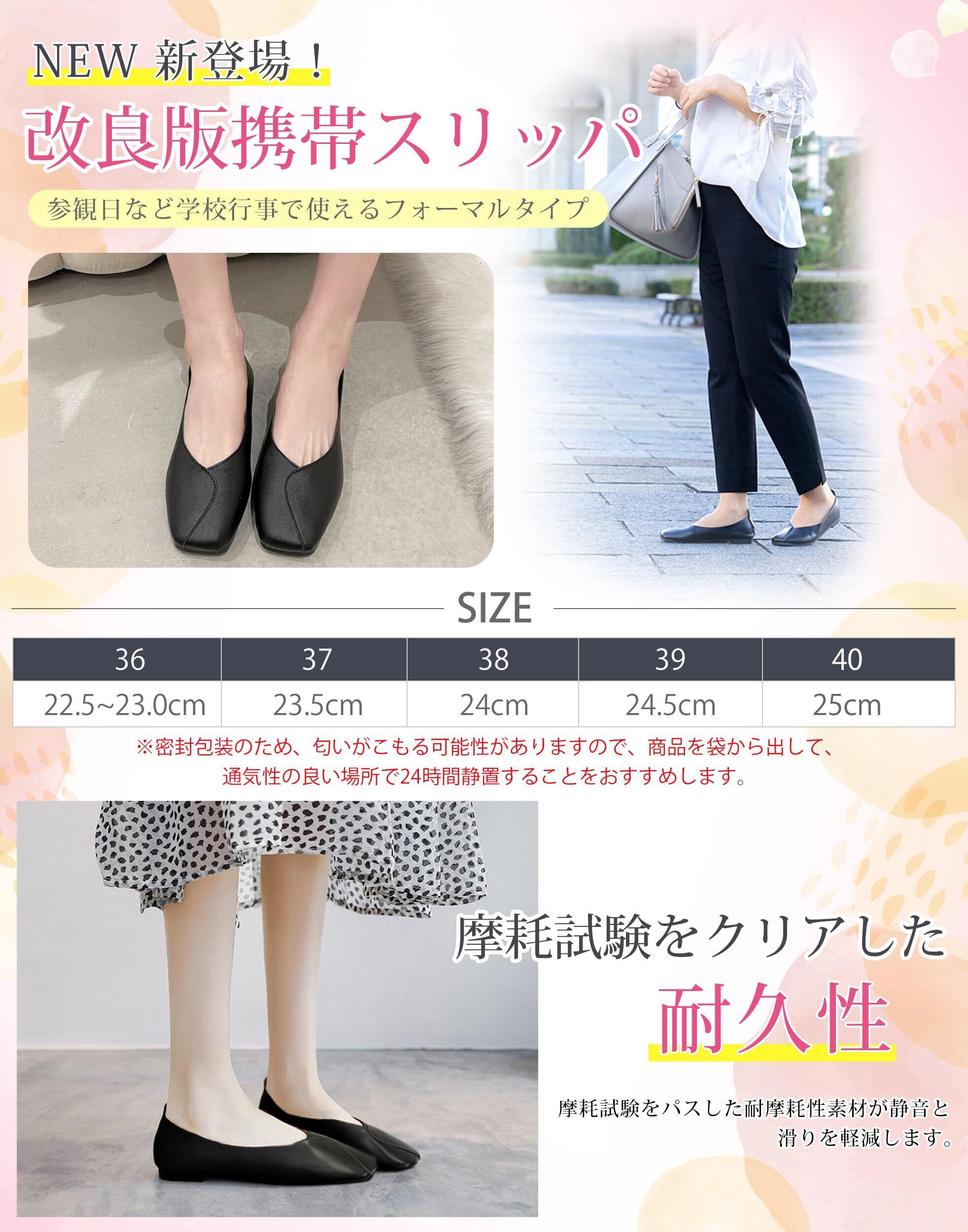 【新登場改良版携帯スリッパ】弊社のスリッパは現役の理学療法士と共同で開発され、数か月にわたる繰り返しのデザイン改良を経て、外観には独特な切り替えデザインを採用しています、女性の柔らかさとエレガンスを示すだけでなく、奔放なファッションのタッチを追加します。着け心地がアップし、サポート力と耐久性が向上。軽くて快適なデザインで、足にピッタリフィットします。この革新的なデザインは、履き心地を高めるだけでなく、清潔で健康的な環境を保ちながら、靴の美しさを楽しむことができます。 忙しい平日でも、リラックスした週末でも、この携帯スリッパはあなたの最高のファッションパートナーとなり、一歩一歩に自信とエレガンスを醸し出します。