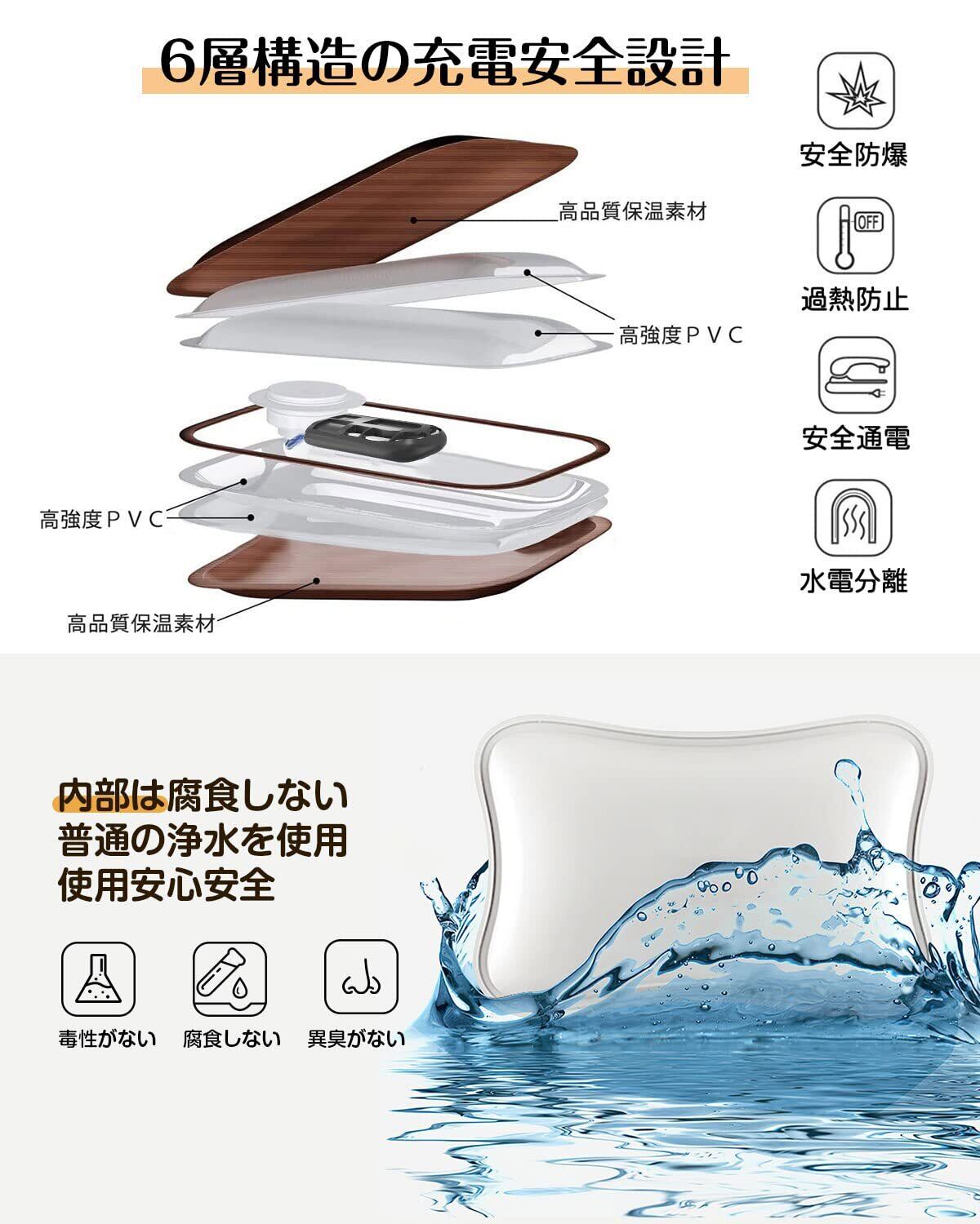 【大きい湯たんぽ!高品質素材·6層防爆設計·自動断電】 弊社の湯たんぽは6層防爆設計、水と電気の分離設計、腐食しない水を用い、温度過熱防止装置は二重保護チップでできており、湯たんぽの温度が75を超えると自動的に電源が切れる安全設計です。