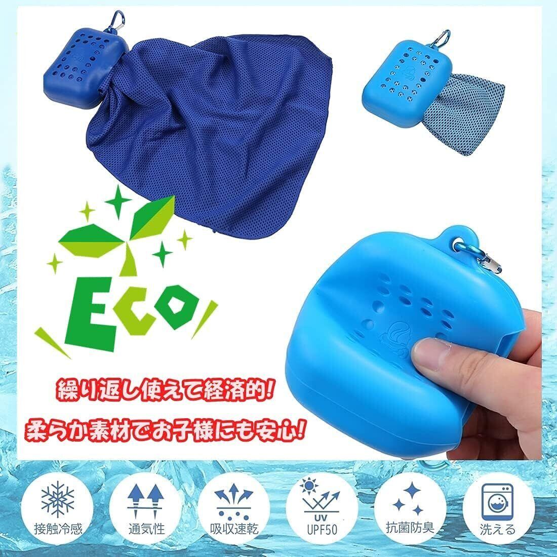 サイズ:タオル/長さ90cm 幅30cm シリコンケース/長さ11cm 幅7cm 高さ4cm セット内容:冷感タオル×2点、シリコンケース×2点,カラビナ付き