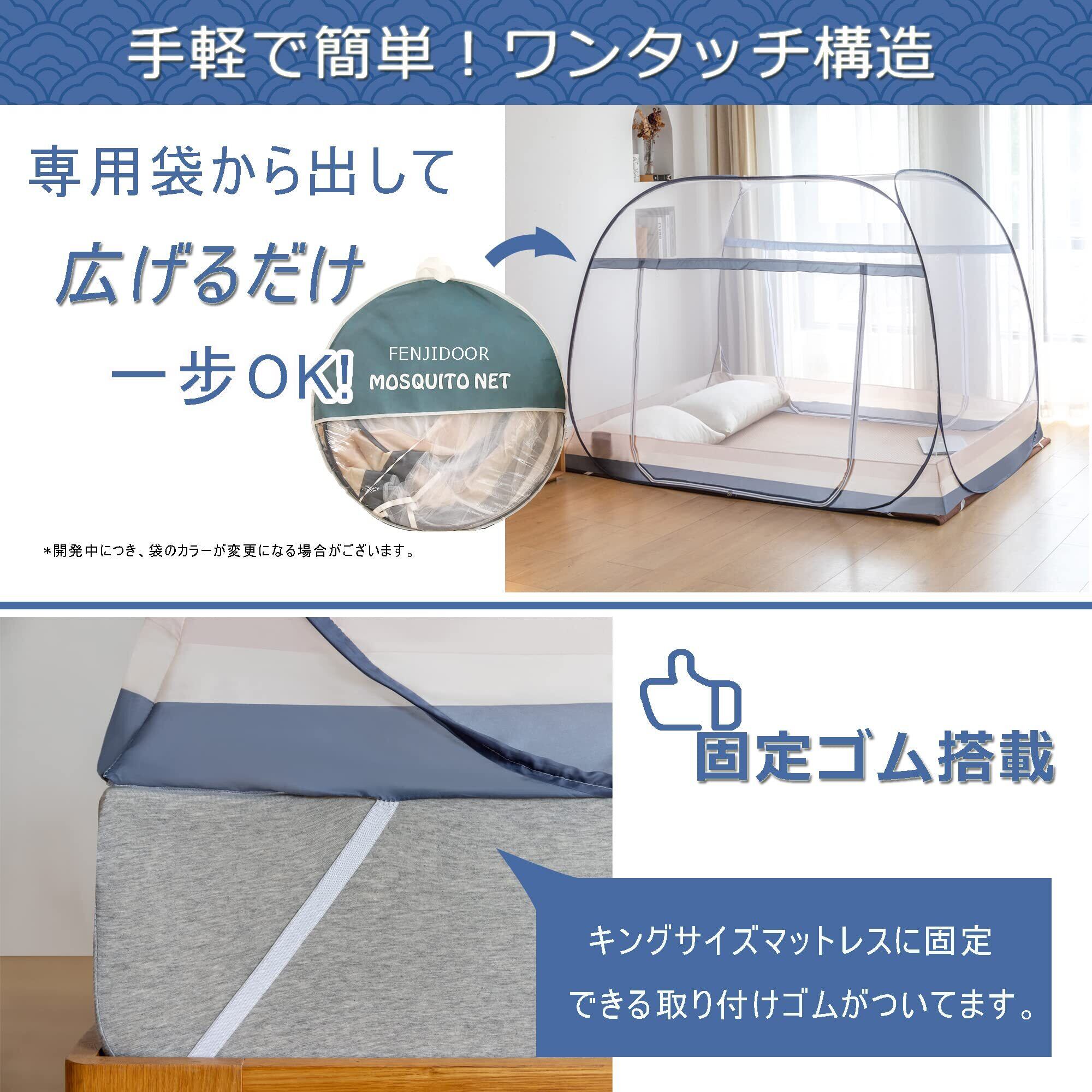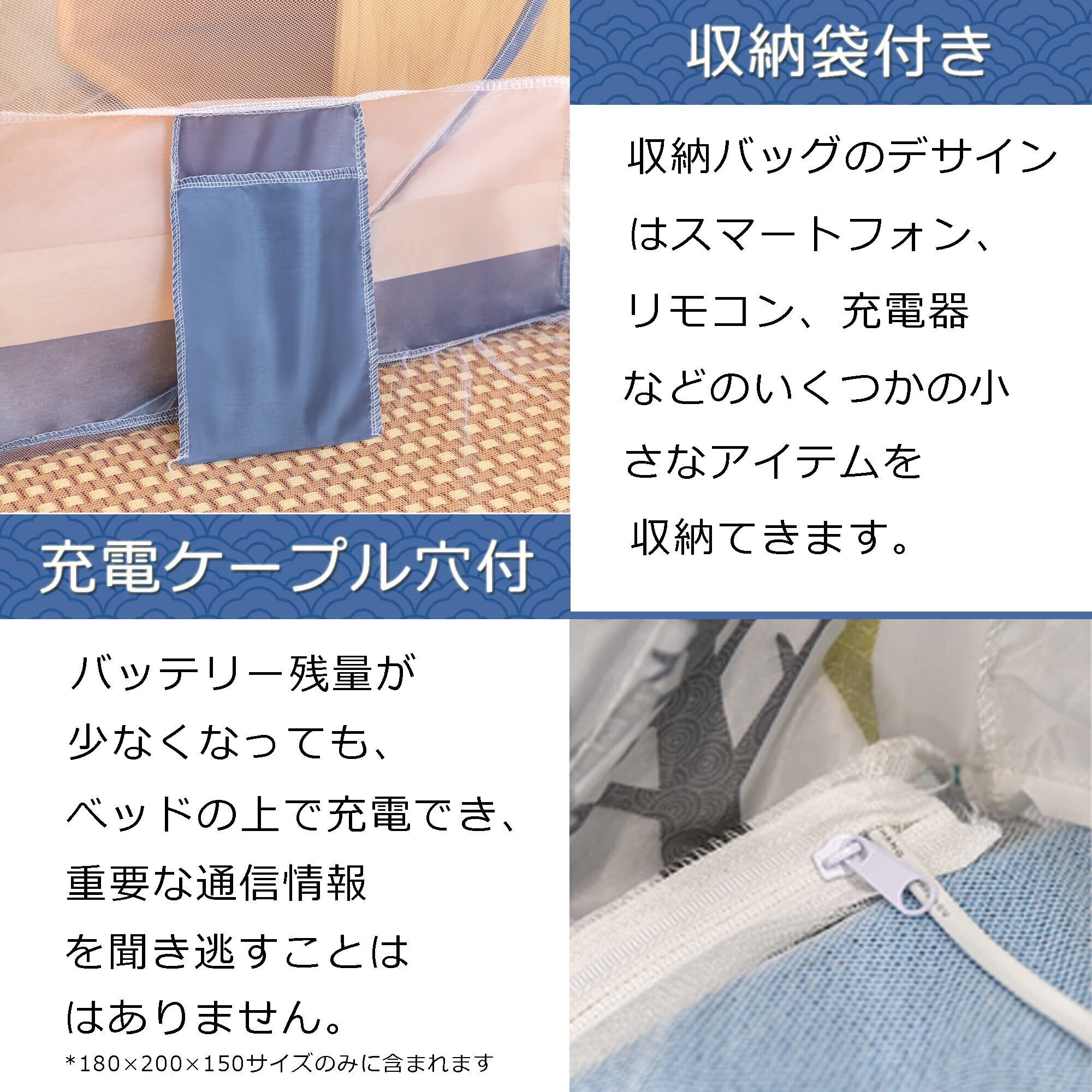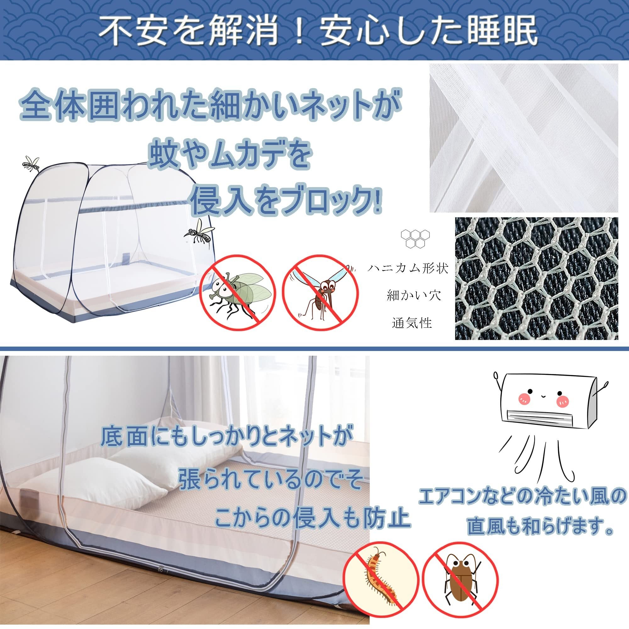 【高密度メッシュ&清潔保持】 通気性を維持しつつ、微細な虫の侵入も許さない高密度ポリエステルメッシュを使用。丈夫で破れにくく、万が一汚れても手洗いで丸洗い可能。清潔な状態を保ちながら長くご愛用いただけます。1.2mまでサイズ展開で、セミダブルのベッドに完璧にフィットします。展開サイズ:幅120cm*長さ19cm*高さ150cm