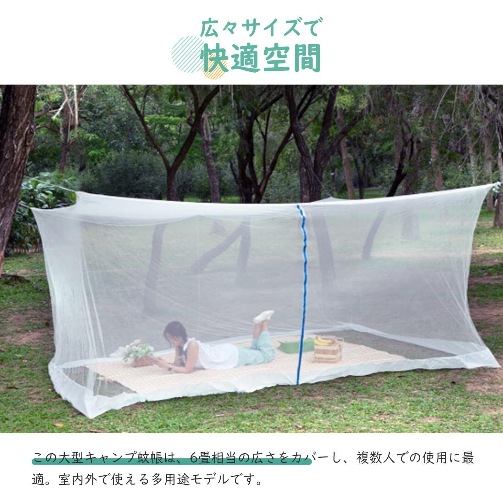 【広々サイズで快適空間】大型サイズで複数人が同時に利用可能。キャンプやピクニックなど、家族やグループでの使用に最適です。このキャンプ蚊帳は室内でも使用可能で、多用途に活躍します。
