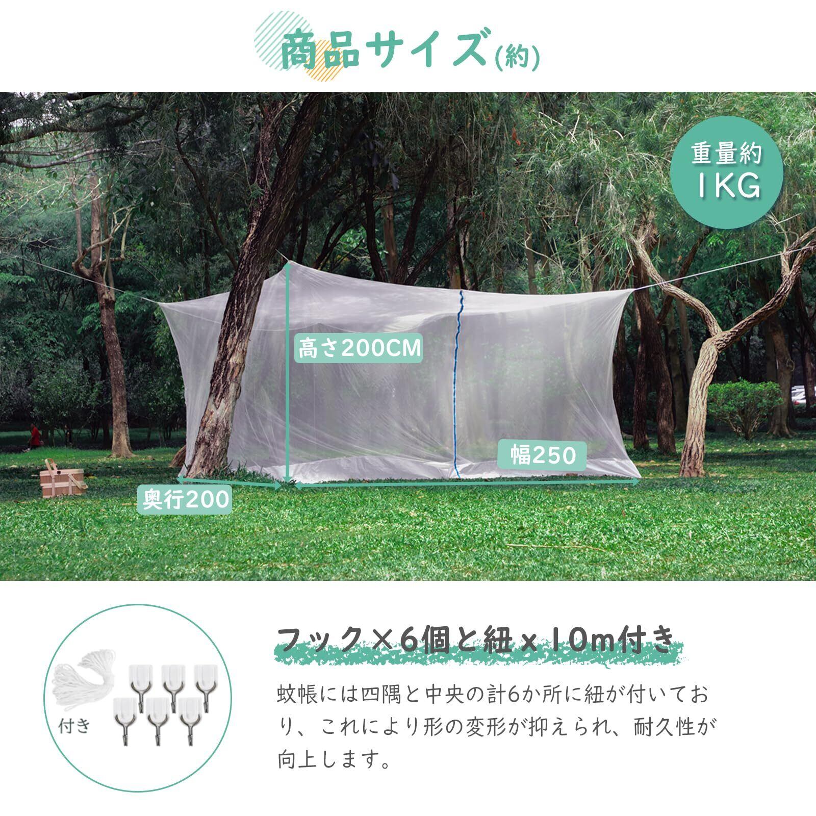 【パッケージ内容】蚊帳本体×1枚、 フック×6個、紐x10m、 日本語説明書×1