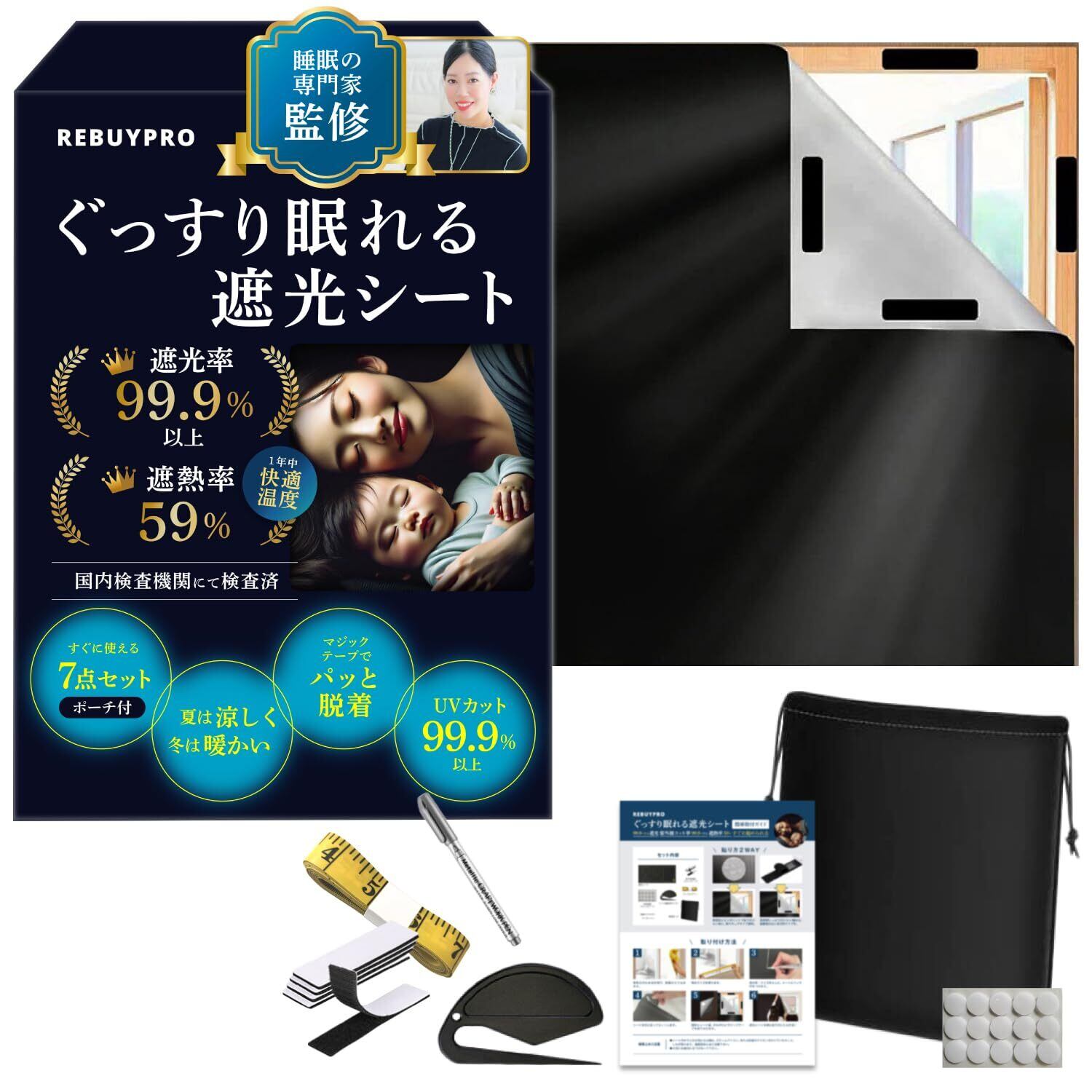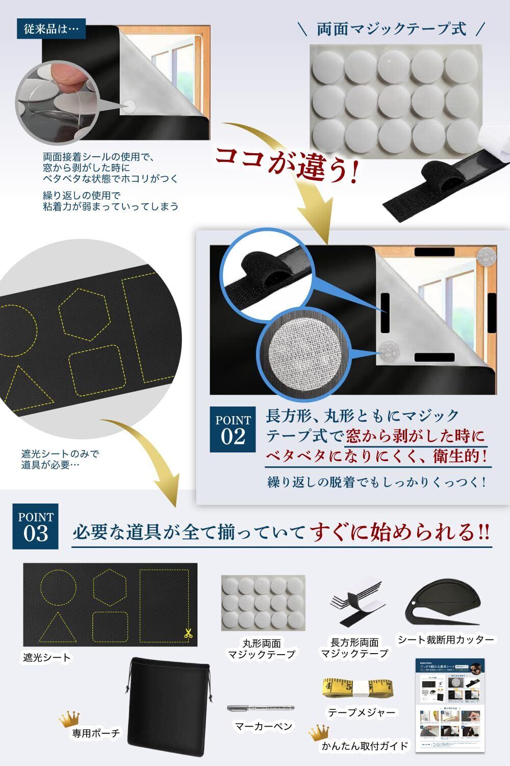 ・【初心者でも安心!3ステップで簡単DIY】必要な道具がすべて揃った7点セット(遮光シート、専用ポーチ、裁断用カッター、マーカーペン、テープメジャー、長方形両面マジックテープ、丸形マジックテープ)なので、届いたその日からすぐに使用できます。初心者でもわかりやすい日本語の取付ガイド付きで、3ステップで簡単に取り付け可能。賃貸住宅でも「跡が残りにくいマジックテープ設計」で安心です。従来品の取り付けの手間や失敗を解消し、プロ並みの仕上がりを実現します。