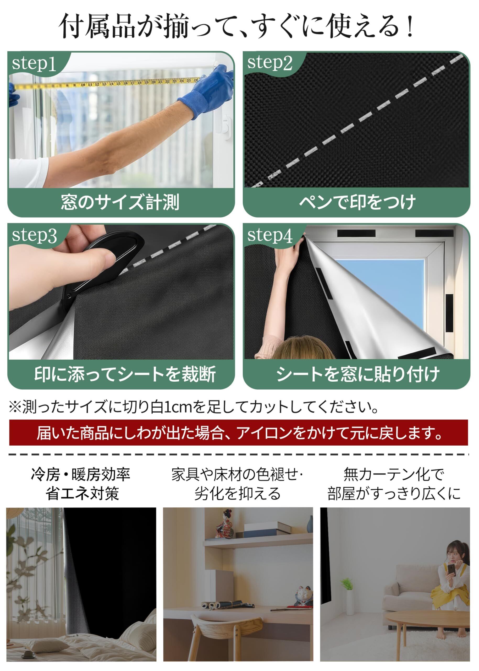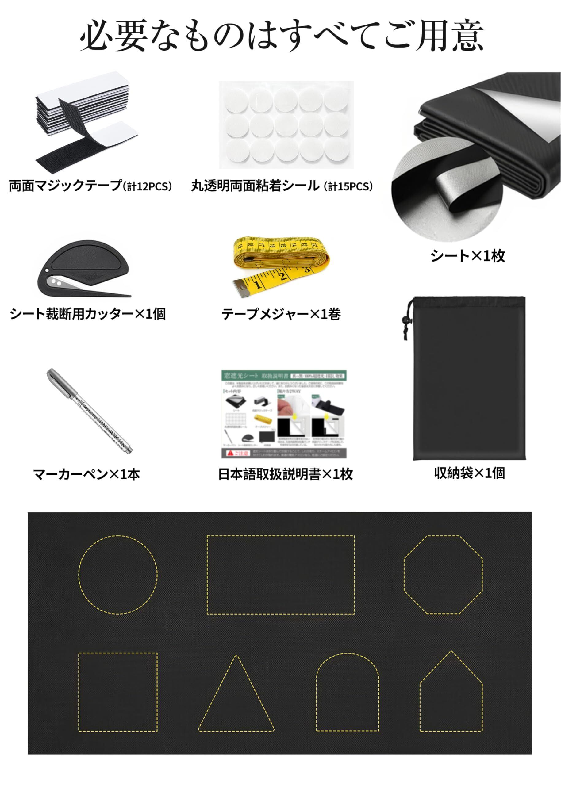 【真っ黒・100%超遮光・目隠し効果】素材:420Dオックスフォード カーボンポリエステル 遮熱シルバーコーティング加工済、窓枠にマジックテープで貼るだけで可視光線透過率0%の超遮光、不透明の「窓遮光シート」。赤ちゃん、昼夜逆転の方、光に敏感な方の部屋に最適な窓ガラス目隠しシートです。目隠し効果も抜群で、窓に貼るだけでお宅の大切なプライバシーをきちんと守ってくれます。無カーテン化で部屋がすっきりして広くになります。携帯用遮光カーテンには、必要なものがすべて用意されています。セット:シート×1枚、丸透明両面粘着シール×1枚(計15PCS)、両面マジックテープ(3×10cm)(計12PCS)、マーカーペン×1本、シート裁断用カッター×1個、テープメジャー×1巻、収納袋×1個。