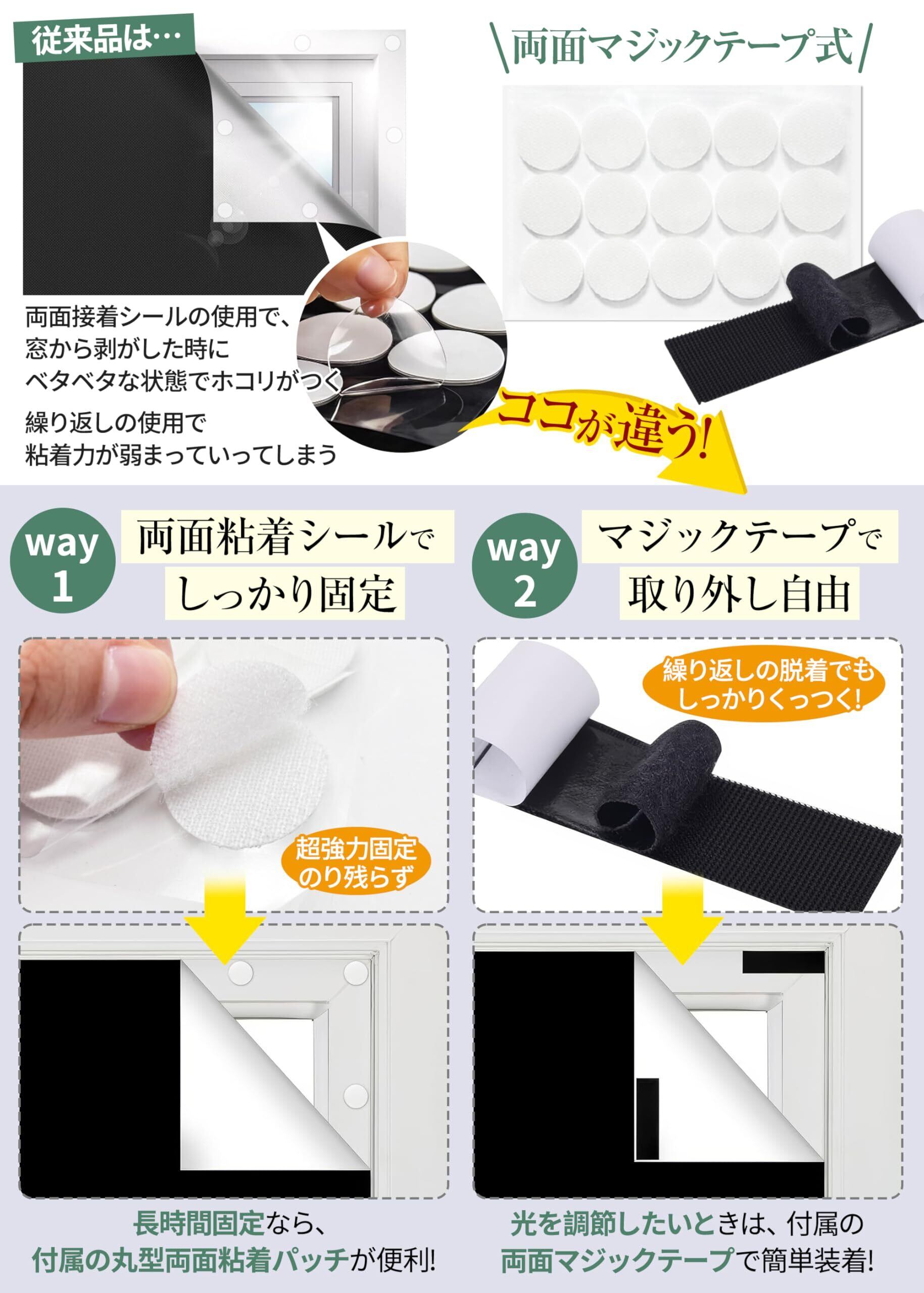 【貼り方2WAY・貼付簡単】水不要・接着剤不要・貼り直し不要!Way1:長時間遮光布の位置を変えない場合は、丸型両面無地粘着パッチを使用するのが適している。Way2:光を取り組みたい場合は付属の両面マジックテープを活用して、貼り付けも取り外しも便利。どんな窓にも簡単に貼り付けることができます。ご注意:弊店のマジックテープ窓遮光シートは直接ガラスの表面に張り付けてはありません、窓枠に貼り付けますから、熱割れにくいです。