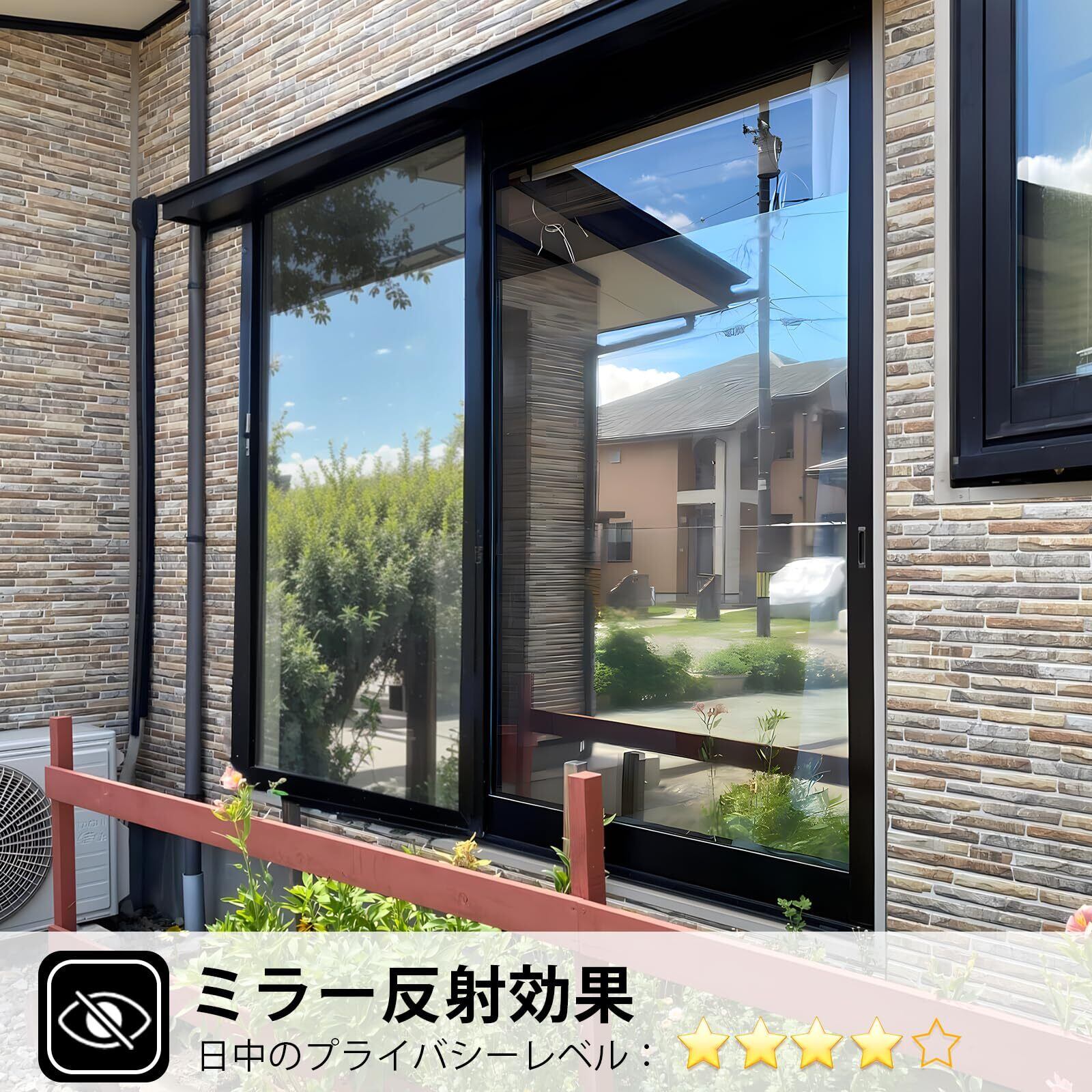 【マジックミラー・目隠し】充分な天然の日光を室内に取り込めて明るさを維持しながら、外からの視線を遮ります。大切なプライバシーをきちんと守ります。昼間は外から見ると鏡のように人影を映す同時に、高い目隠し効果を生かします。室内から見ると、紺色の透明シートに見え、視界を損なわず、気軽に外の風景を眺めます。一般家庭のガラス窓、オフィス、会議室、事務室などの目隠し装飾に非常に適用しています。室内が屋外より明るい場合(夜間、照明を使う場合など)には室内が見えますのでご注意下さい。