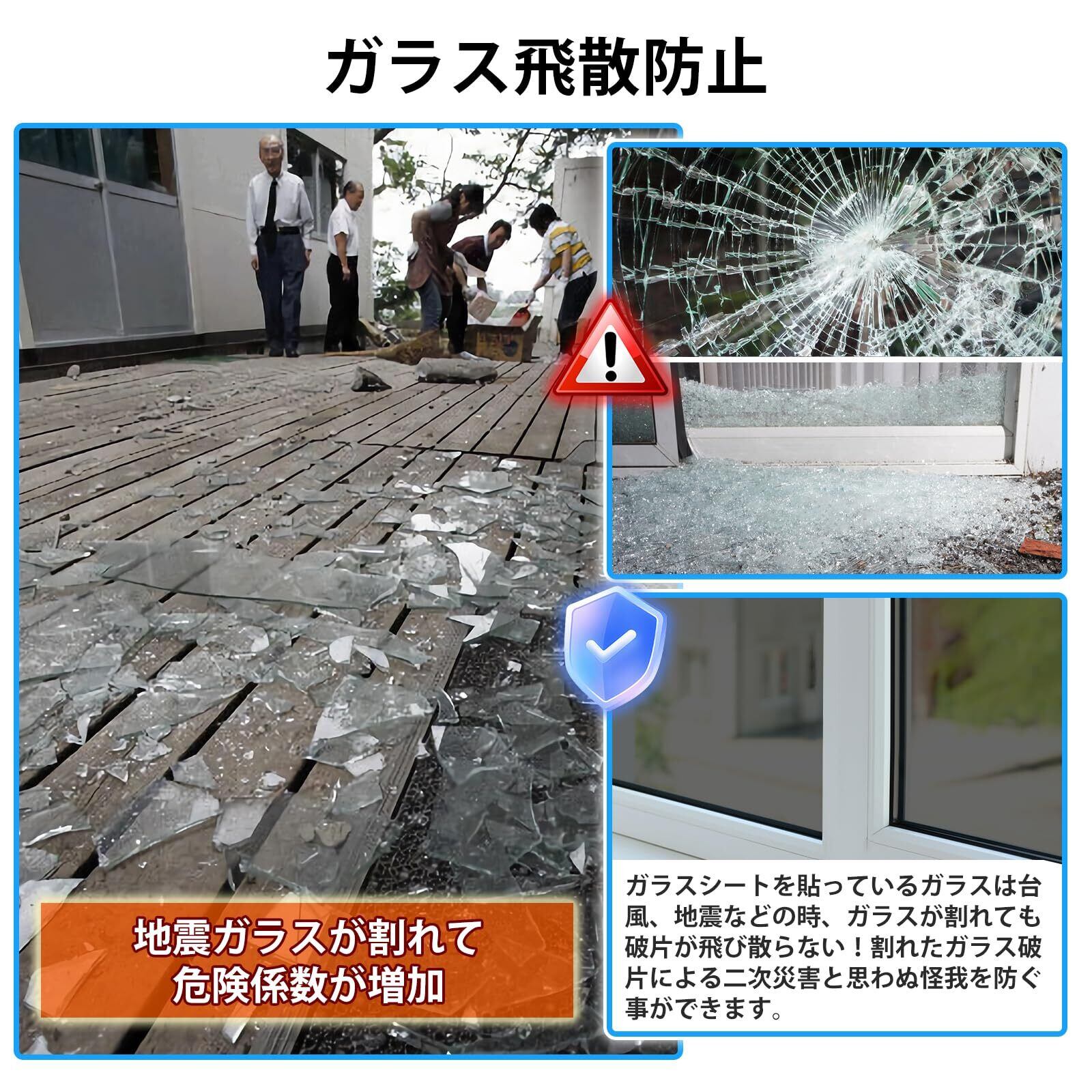 【ガラス飛散防止・ガラスキズ防止】 貼り付け操作が終了後、静電気吸着タイプなので粘着力が戻り、台風、地震などの時、ガラスが割れても破片が飛び散らない! これにより、ガラスの破片による二次災害や不測の被害を防ぐことができます。また、不注意によるガラス表面の傷を防ぐこともできます