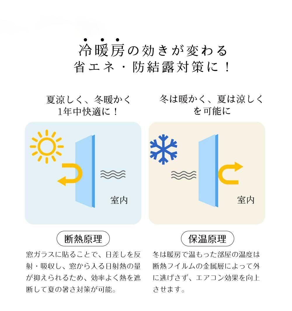 【省エネ・結露防止】この窓フィルムは、窓ガラスを通過する熱の量を減少させるため、室内の温度を一定に保ちます。 冷房や暖房の効率が向上し、電気代の節約にも貢献します。さらに、フィルムが熱移動を調整することで、窓面と室内の温度差を縮小し、結露の発生を効果的に軽減。エアコンやヒーターへの負荷を抑えながら、快適な室内環境を持続的に維持する補助的な効果を発揮します。