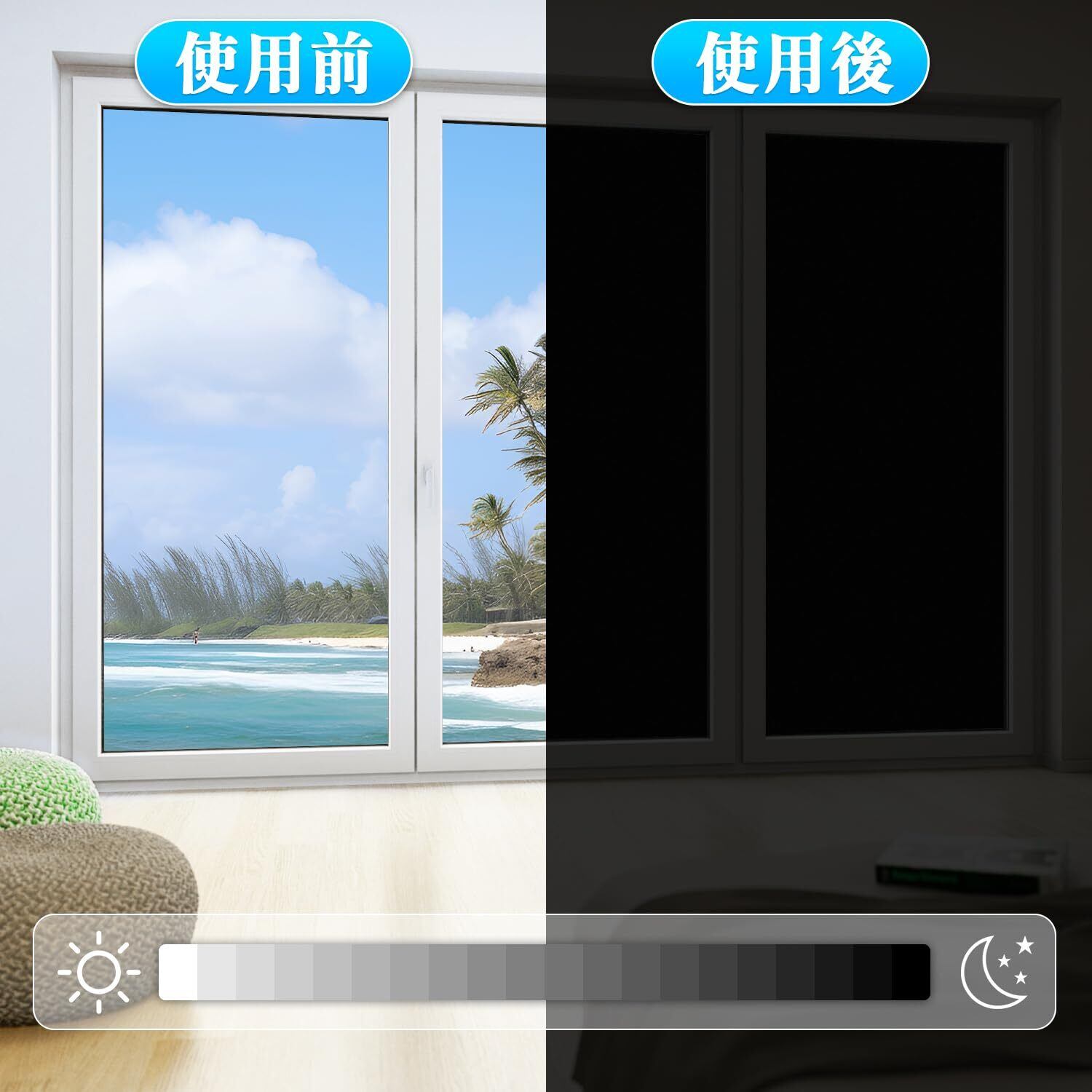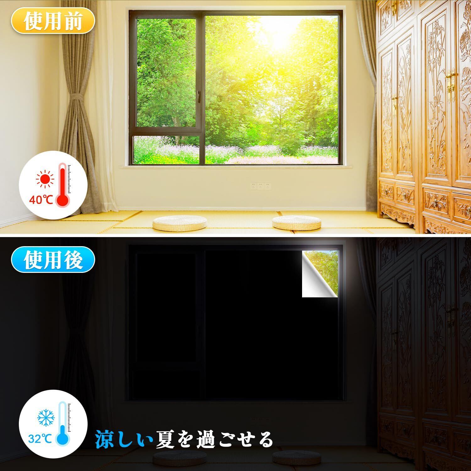 ■【真っ黒・目隠し効果・100%超遮光】素材:420Dオックスフォード カーボンポリエステル 遮熱シルバーコーティング加工済、可視光線透過率0%の超遮光、不透明の「窓遮光シート」。赤ちゃん、昼夜逆転の方、光に敏感な方の部屋に最適な窓ガラス目隠しシートです。目隠し効果も抜群で、窓に貼るだけでお宅の大切なプライバシーをきちんと守ってくれます。無カーテン化で部屋がすっきりして広くになります。