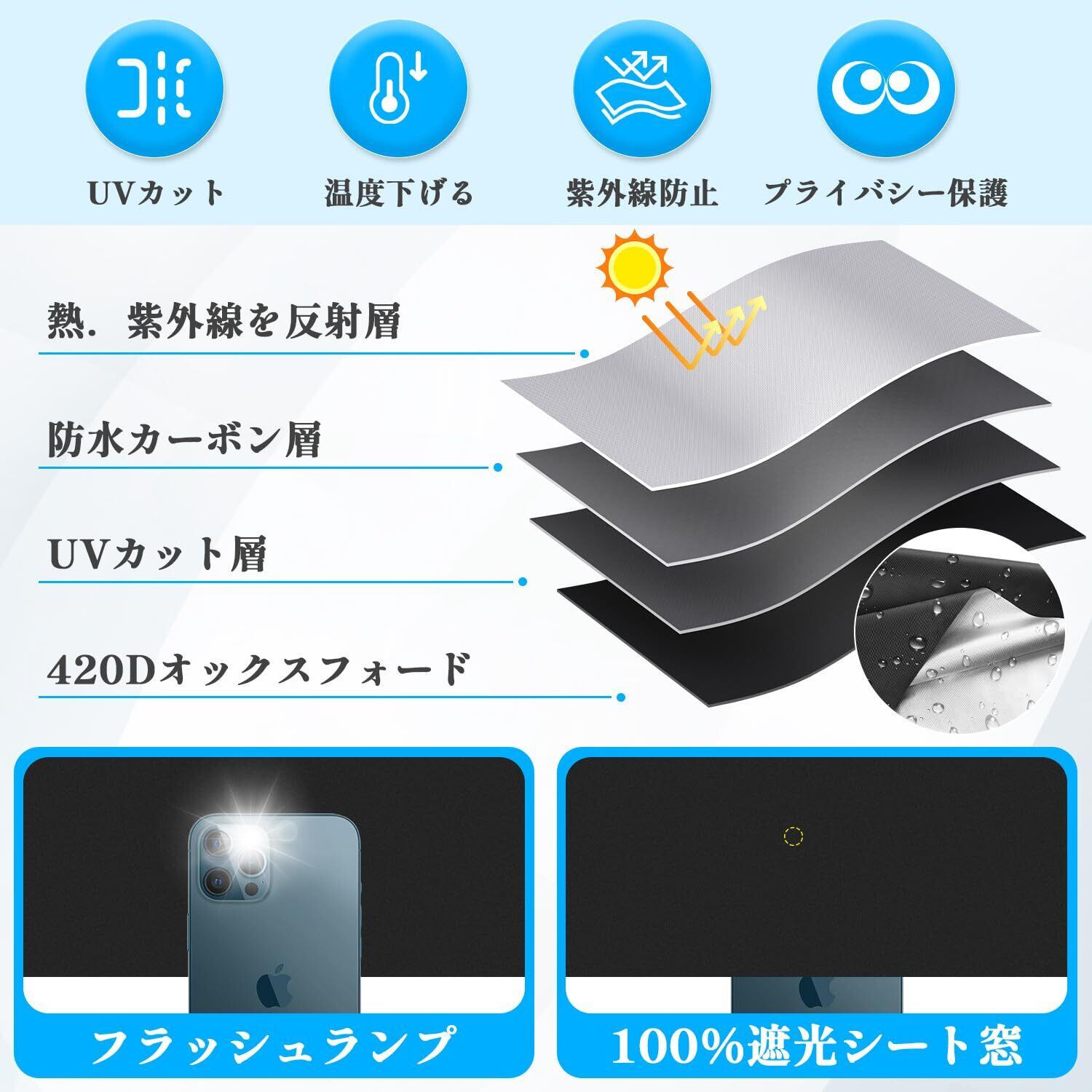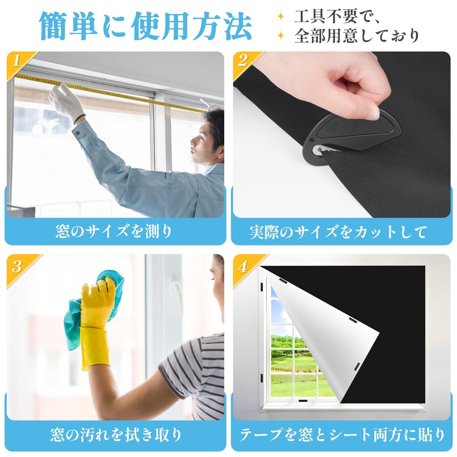 ■【様々なシーンで大活躍】子供部屋や、寝室などの自宅だけでなく、保育園や幼稚園、オフィスや車内などの窓にテープで貼り付けるUVカット防水遮光シートです。プライバシー保護や睡眠の質向上にも役立ちます。フリーカット可能だから、どんなサイズにも合わせやすいです。5サイズがあります。セット内容:シート、丸透明両面粘着シール、両面マジックテープ、シート裁断用カッター、テープメジャー、収納袋、日本語説明書。