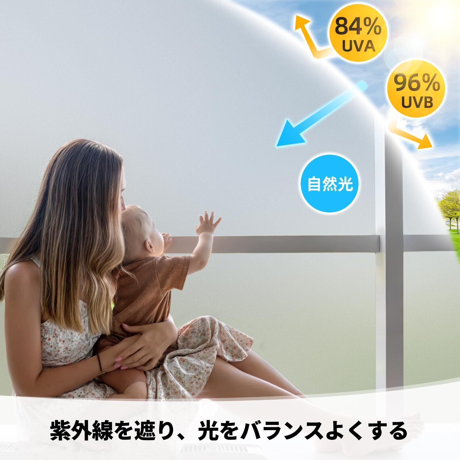 【uvカット / 紫外線防止】窓ガラス目隠しフィルムのUVカット機能で、紫外線による家具の変色、劣化を効果よく防止。そして窓 目隠しシートを貼り付くことで地震や台風などでガラスが割れても、破片が飛び散らない怪我を防ぐ事にも少し役立ちます。
