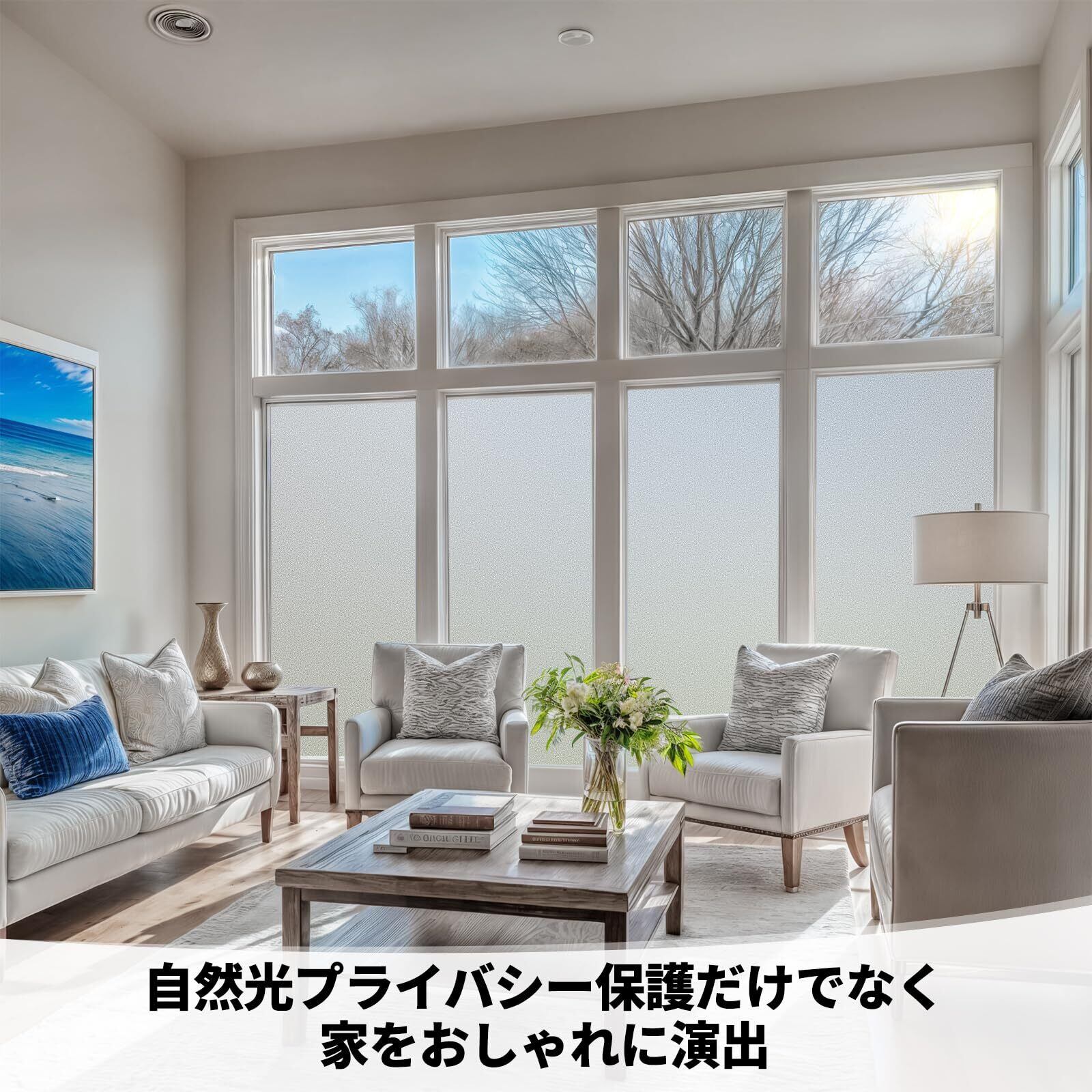 【目隠し / プライバシー対策】20cm以上離れていれば、天気や昼夜を問わず、室内を見えにくくする窓ガラス目隠しフィルム、かつ、採光性が抜群。無カーテン化で部屋がすっきりして広くになります。家庭の窓、ガラス引き戸、オフィス、会議室、浴室、フランス窓などに幅広く適しています。