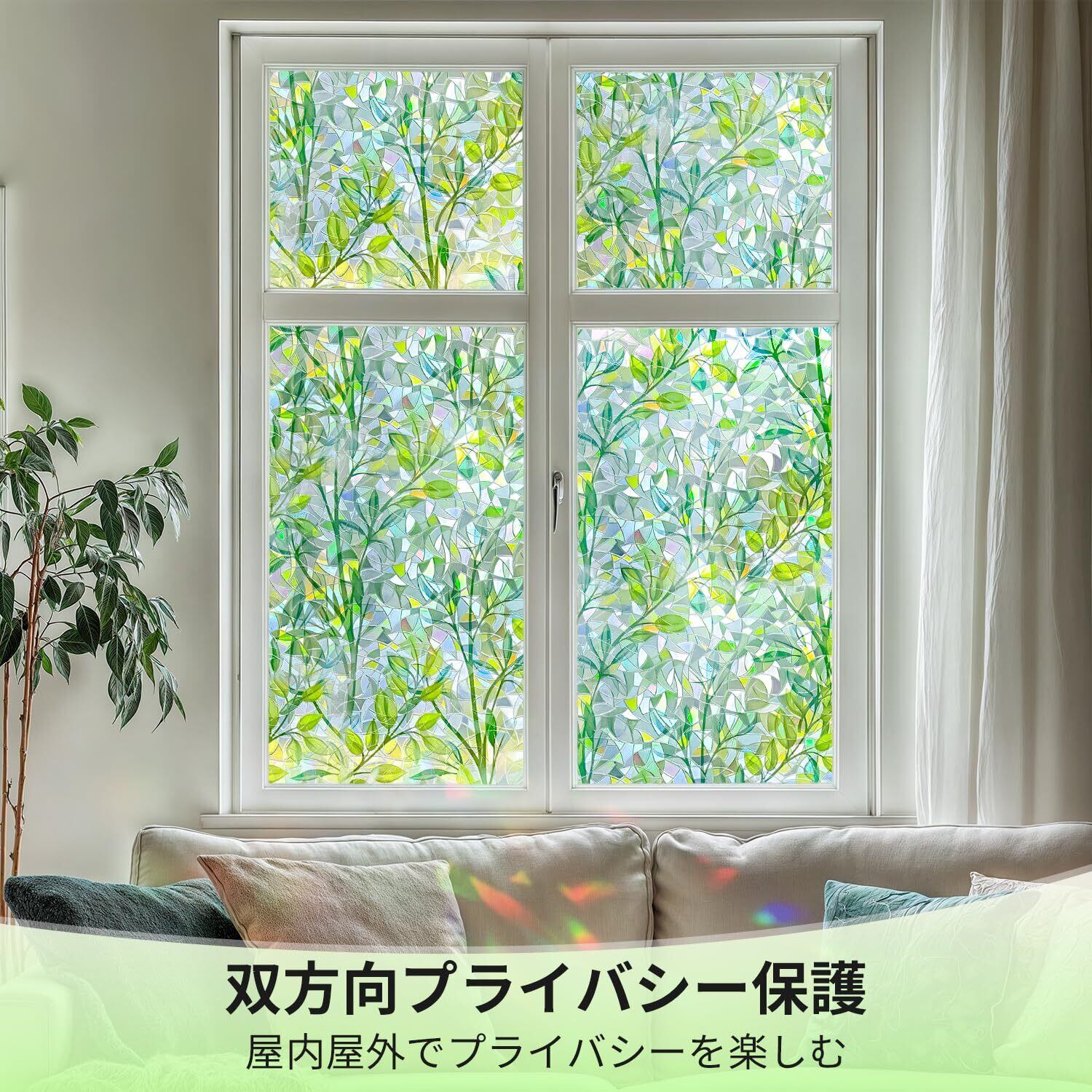 【目隠し・プライバシー保護】本窓フィルムは、20cm以上離れた場所からは天候や時間帯を問わず、室内が見えにくくなる設計です。外からの視線をしっかり遮りながらも、十分な自然光を採り入れ、明るさを保ちます。昼間も夜間もプライバシーを守りながら、室内を快適に明るく保つのに貢献。カーテンで暗くなりがちな空間の閉塞感や圧迫感を軽減し、開放的な住環境を実現します。なお、浴室など特にプライバシーが強く求められる場所での使用はお控えください。より高い遮蔽性が必要な場合は、専用の製品もご用意していますので、あわせてご検討いただけますと幸いです。