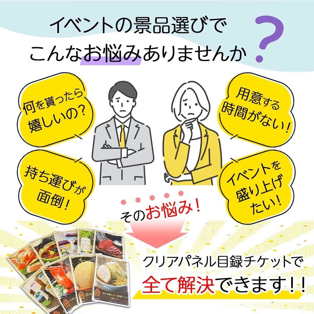 クリアパネルに商品写真と目録チケットが入った状態でお届けとなります。●目録チケット目録デザインの二つ折り用紙(A4サイズ)で、ハガキまたはWebから引換の申込をすると、掲載内容の商品が2週間程度で届きます。●クリアパネルA4サイズの透明な封筒仕様のパネルです。裏面は簡易組立のスタンド仕様で自立します。吊り下げ用の穴もあるので壁掛けもできます。イベント終了後は中身を入れ替えて使えます。セット内容:クリアパネル、商品写真、目録チケット有効期限:最低3か月※在庫状況により3か月以上ある場合があります。
