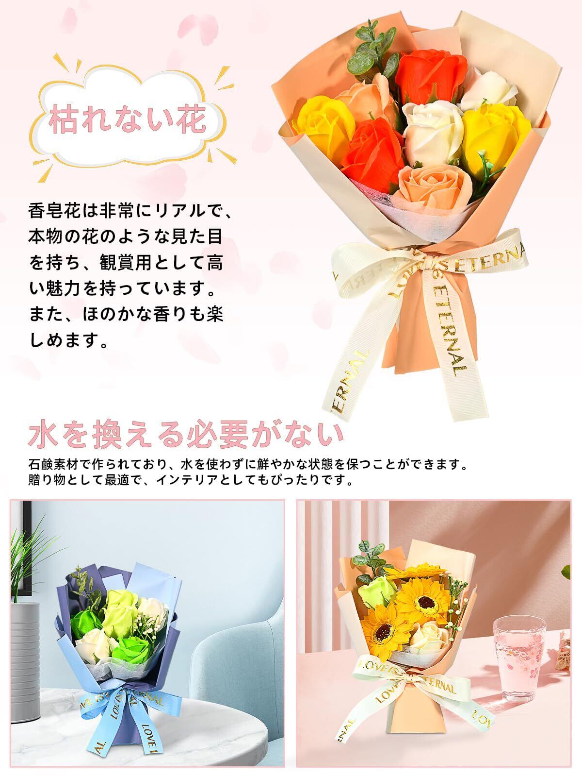 【花粉アレルギー対策強化】: ソープフラワーの大きな魅力の一つは、その花粉が含まれていないという点です。これは、伝統的な生花によく見られる花粉アレルギーの心配を完全に排除します。敏感な皮膚やアレルギーを持つ方でも、この美しい枯れない花 プレゼントを心から楽しむことが可能です。さらに、その美しさを長く保つことができるため、いつでも新鮮な花々の喜びを感じることができます。