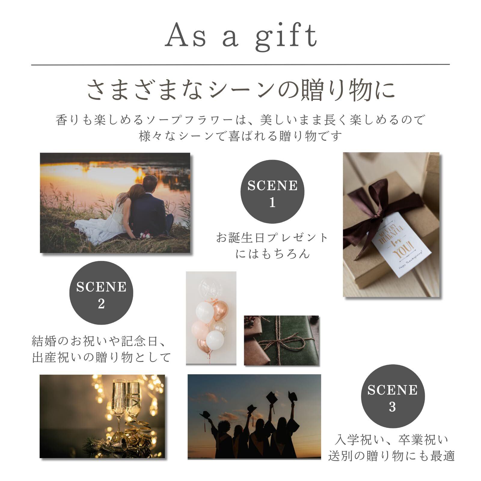 【様々なシーンの贈り物に】誕生日・開店祝い・新築祝い・結婚祝い・プロポーズ・結婚記念日・出産祝い・歓送迎会・記念品・卒業祝い・入学祝い・退職祝い・送別会・内祝い・お見舞い・自宅用・記念日・母の日・父の日・敬老の日・還暦祝い・クリスマス・お中元・お歳暮・お見舞い・バレンタインデー・ホワイトデーや彼氏・彼女や女性のフラワーギフトのプレゼントに最適なバラのソープフワラーです。