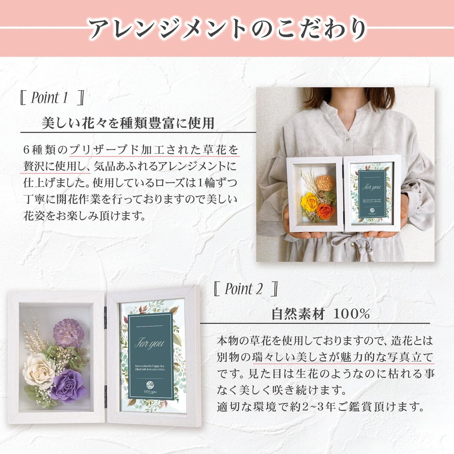 【 感謝の気持ちを込めて.思い出の写真と一緒にプレゼントしませんか? 】生花と違い、長期間枯れずに美しく咲き続けるお花は安心して贈り物にできます。思い出の1枚を枯れないプリザーブドフラワーと共に、いつまでも美しく飾りましょう。【 枯れない花でお手入れ不要 】生花であれば、毎日の水やり・お手入れが必要ですがプリザーブドフラワーはお手入れ不要です。直射日光・高温多湿を避けましたら、約2〜3年間美しい状態で咲き続けることができます。また生花にはある、匂いや花粉など衛生面での心配もないため、病院・施設においても安心して飾ることができます。