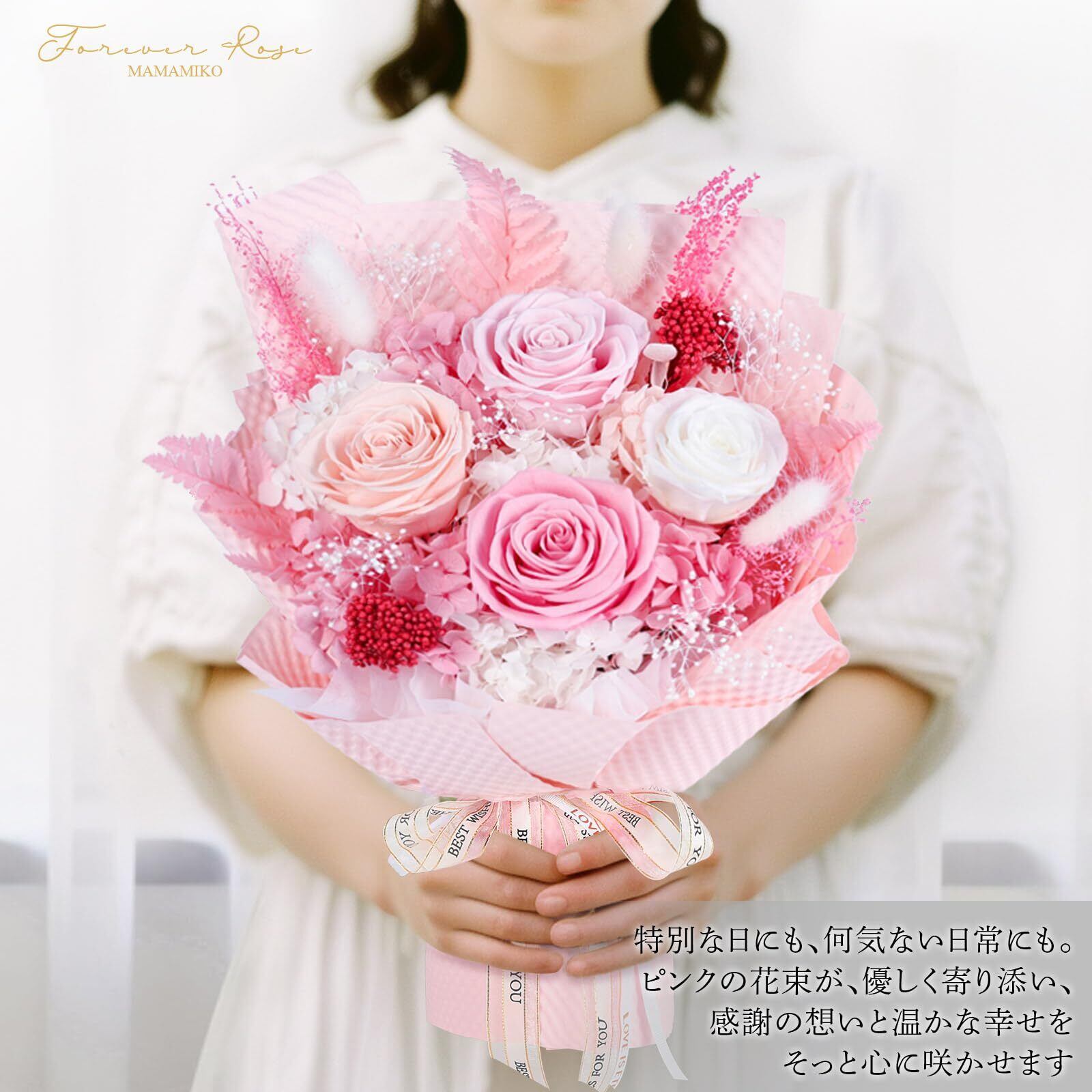 【手入れ不要、3年以上咲き続ける】このピンク色の花束は、日本から発展したプリザーブドフラワー技術を用い、高品質な生花とバラを選んで丁寧に加工されています。生花のように儚く枯れることがなく、3年以上その美しさを保ちます。さらに、水やりやお手入れが不要で、そのまま飾って花の美しさを気軽に楽しむことができます。