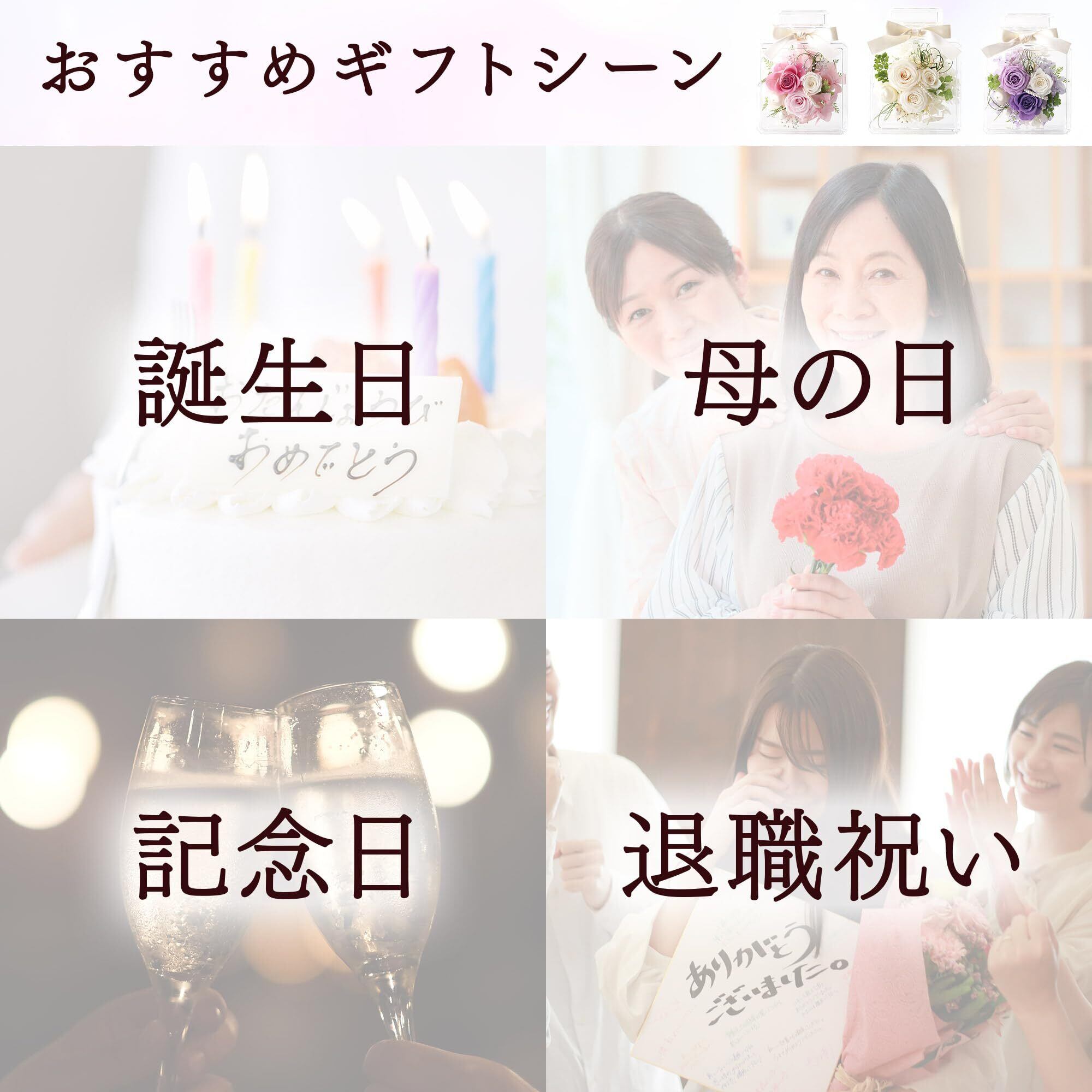 花材の種類はアレンジメントの雰囲気が変わらない程度に予告なく変更する場合がございます。 お花の痛みや色あせを早めますので、湿気・直射日光を避けて、室内でお飾りくださいませ。 ひとつひとつ大切に手作りしております 天然素材のプリザーブドフラワーを使用しているため、写真とまったく同じ形・配置にはなりません。 その点、ご了承の上ご購入くださいませ。