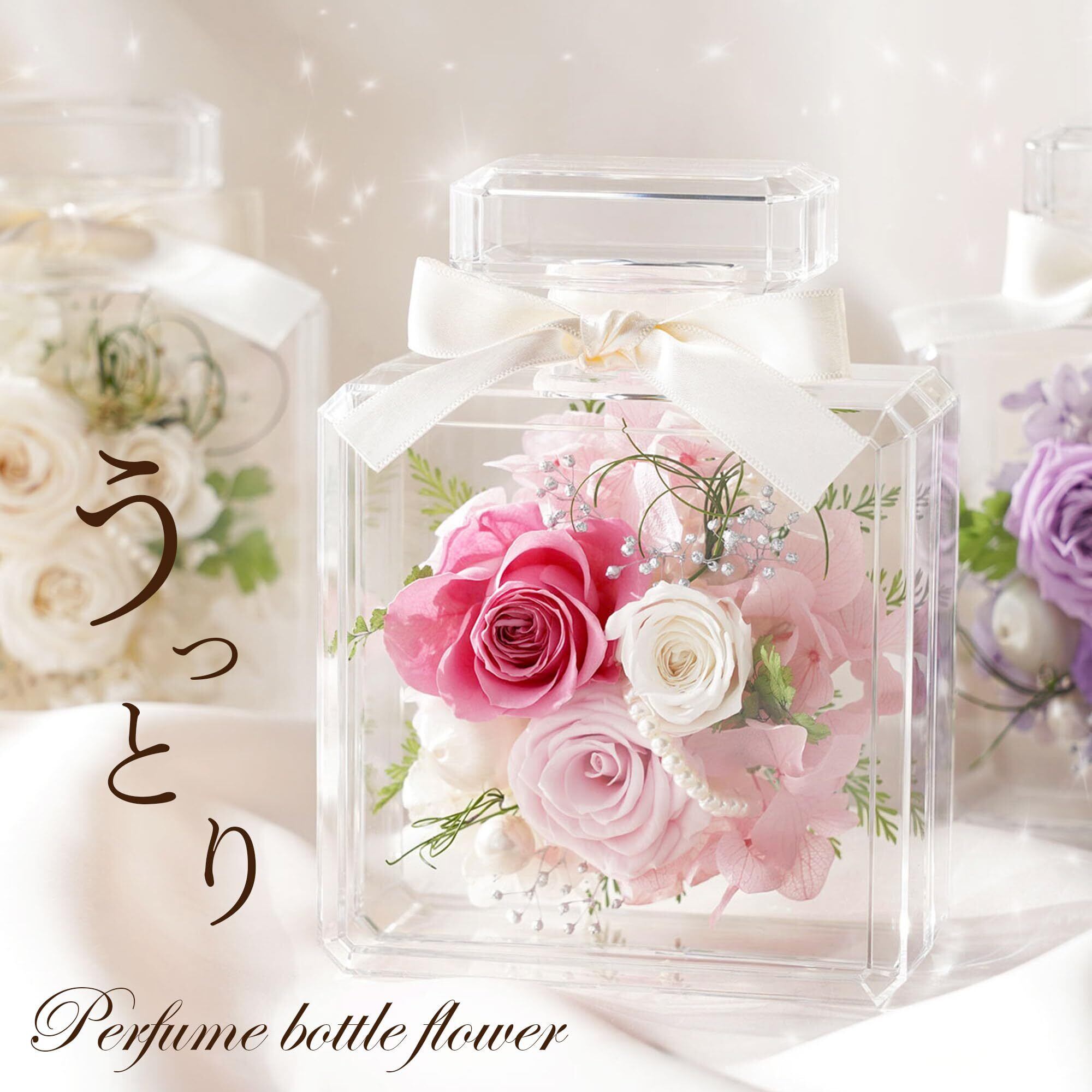 【パフュームボトル型フラワー】 飾りやすいサイズ感の香水型のボトルに 枯れないプリザーブドフラワーを入れた女性なら思わずキュンとしちゃうギフト お花を贈ってるのにまるで香水を送っているような気分も味わえて、 お洒落なあの人へのギフトにぴったりです。
