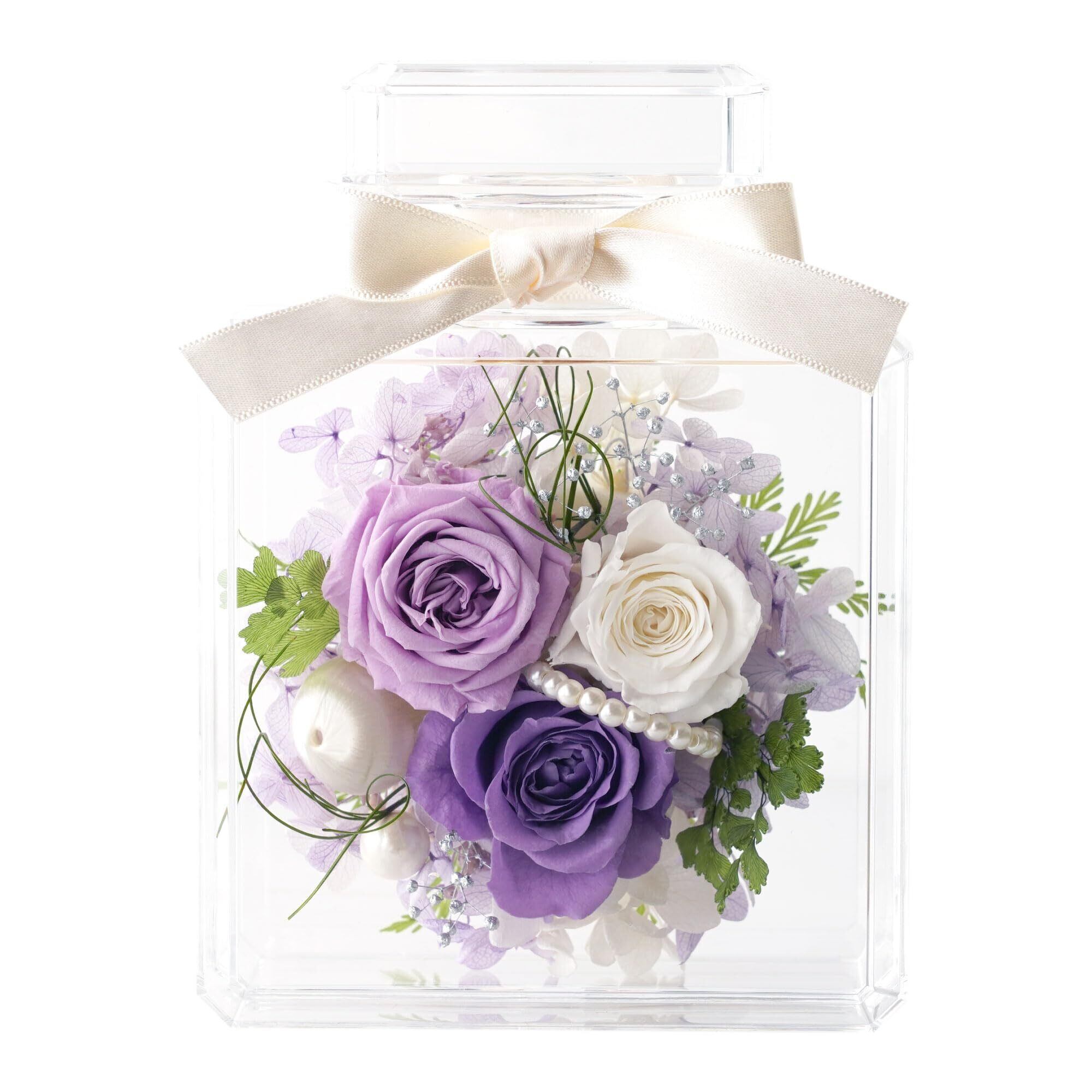 素材 お花アレンジ:プリザーブドフラワー(バラ、紫陽花、かすみ草、葉物類)、パールなど パフューム型ボトル:アクリル樹脂製