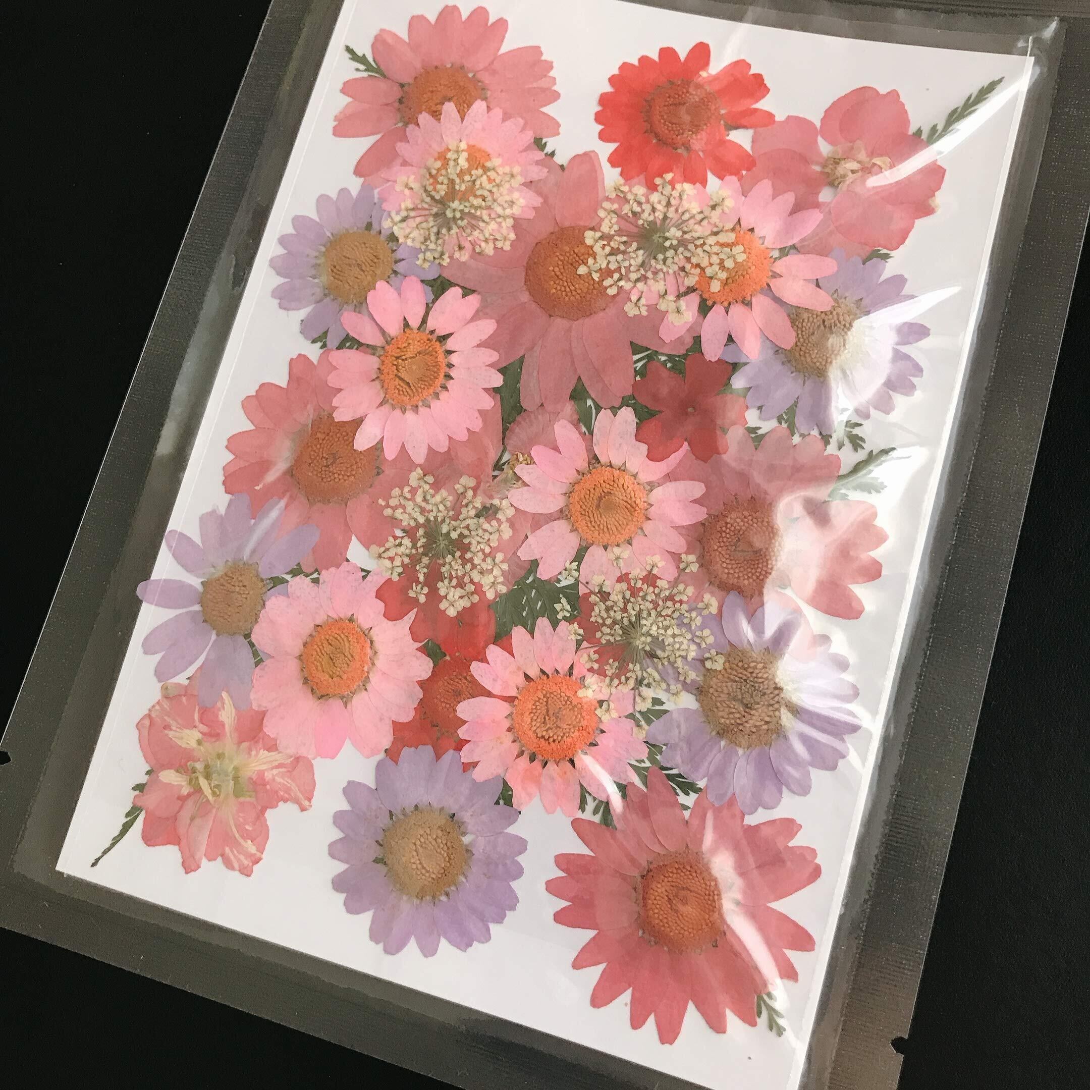 ブロッサム、ノースポール、レース押し花など大小ミックス7種類のドライフラワーと、葉っぱ2種類を合計35輪集めたセットになります。 レジン封入、DIY手作りアクセサリーの制作、ハーバリウム、ハンドメイド携帯ケースの素材、ネイル用押し花などとして、様々な用途で使えます。ピンク、紫、ホワイト、赤、レッド、パープル マーガレット 菊