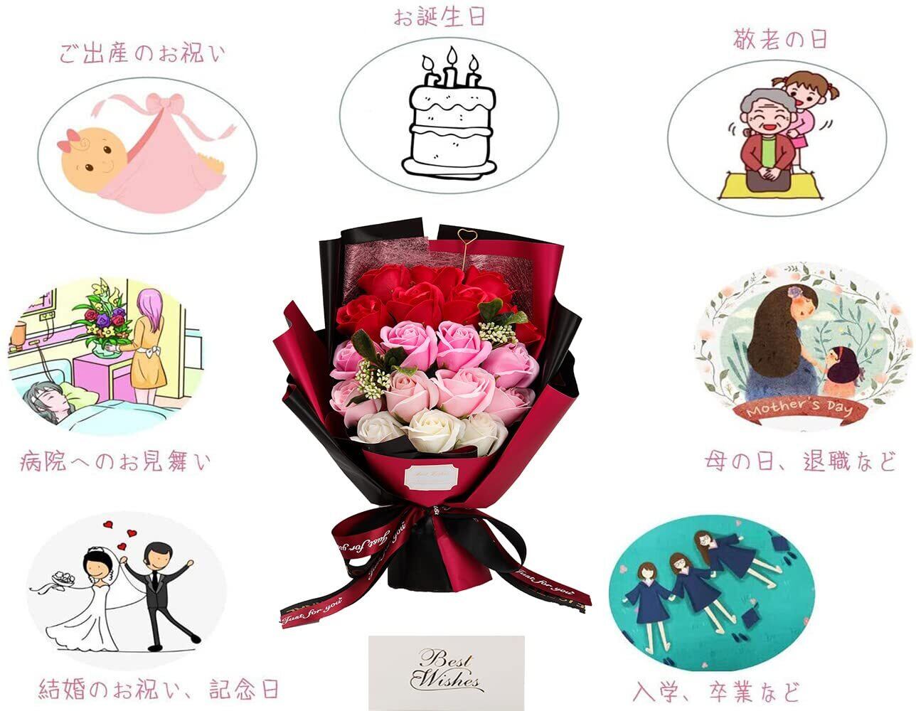 1.✿【大人気なソープフラワー 】:ソープフラワーは花びら一枚一枚が香りのよい石鹸からつくられた、ほのかに香る観賞用のお花です。生花と違って水やりの必要もなく枯れることがありません。ブリザードフラワーとも違ってほのかな香りを楽しめます。花粉等も無いためアレルギーの原因となることもありません。アイディアに満ち溢れ、柔らかな質感、鮮やかな色合いと雰囲気を長い間お楽しみいただけ、彼女、奥様、母の日のプレゼント、誕生日プレゼント、結婚祝い、卒業式など様々なシチュエーションにピッタリです! 感謝やお祝いの事の贈り物として目を引くおしゃれグッズです。