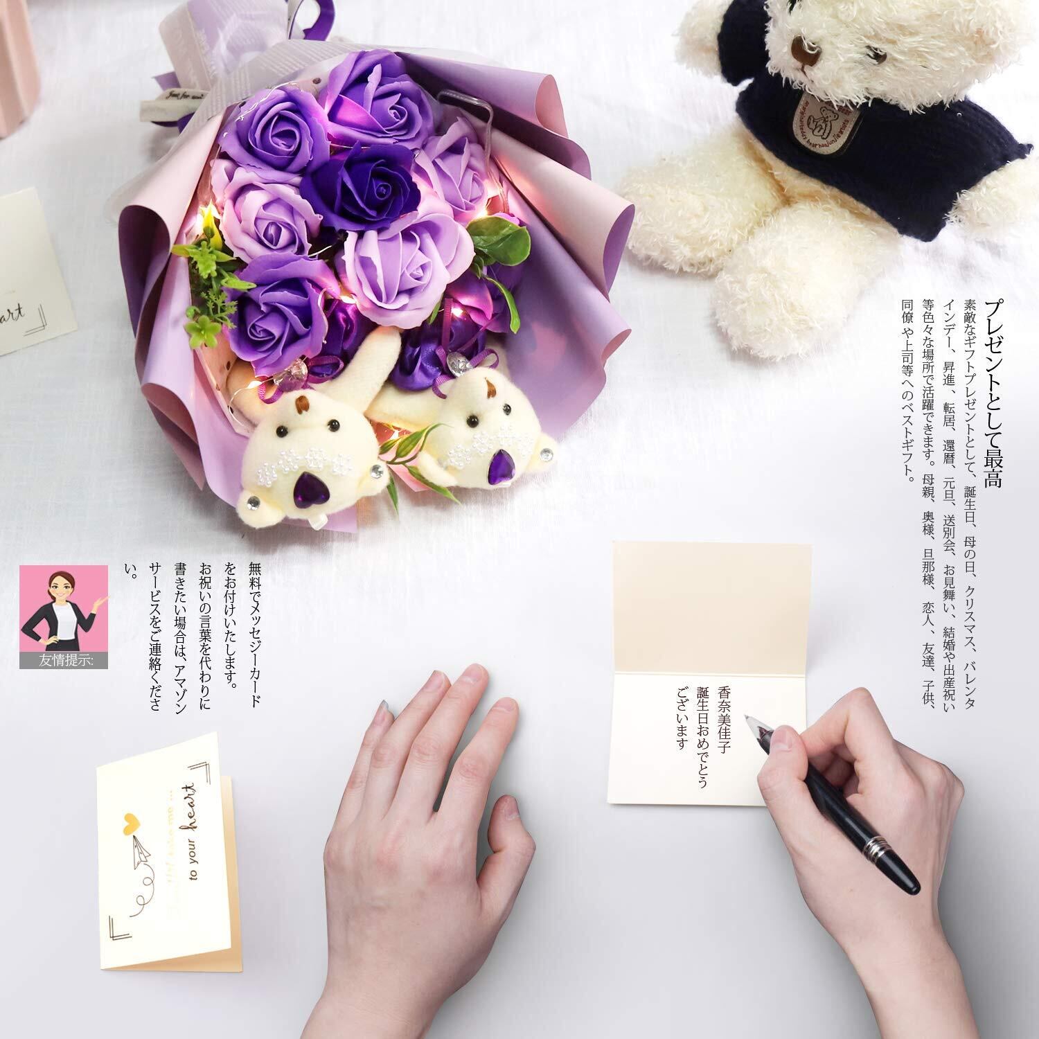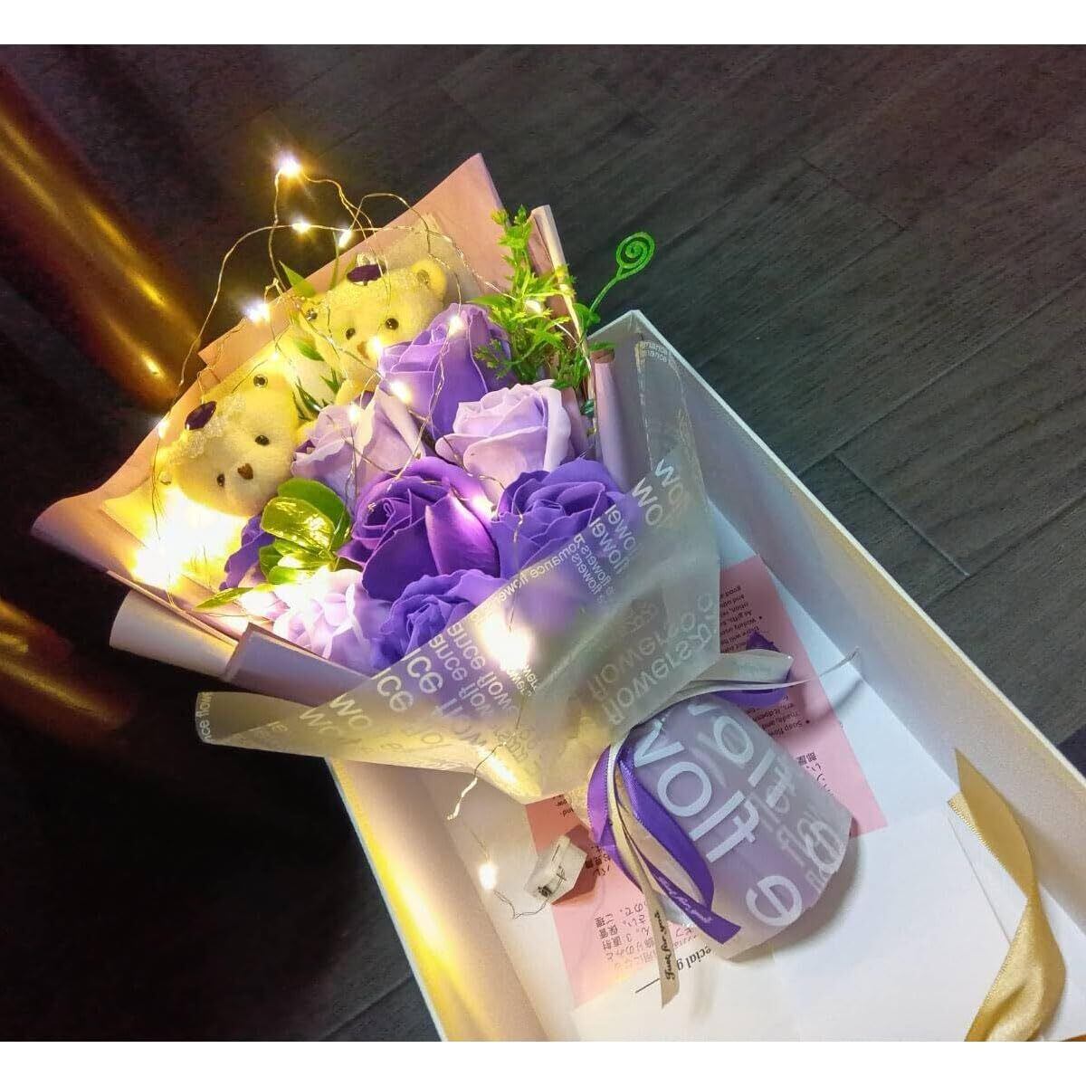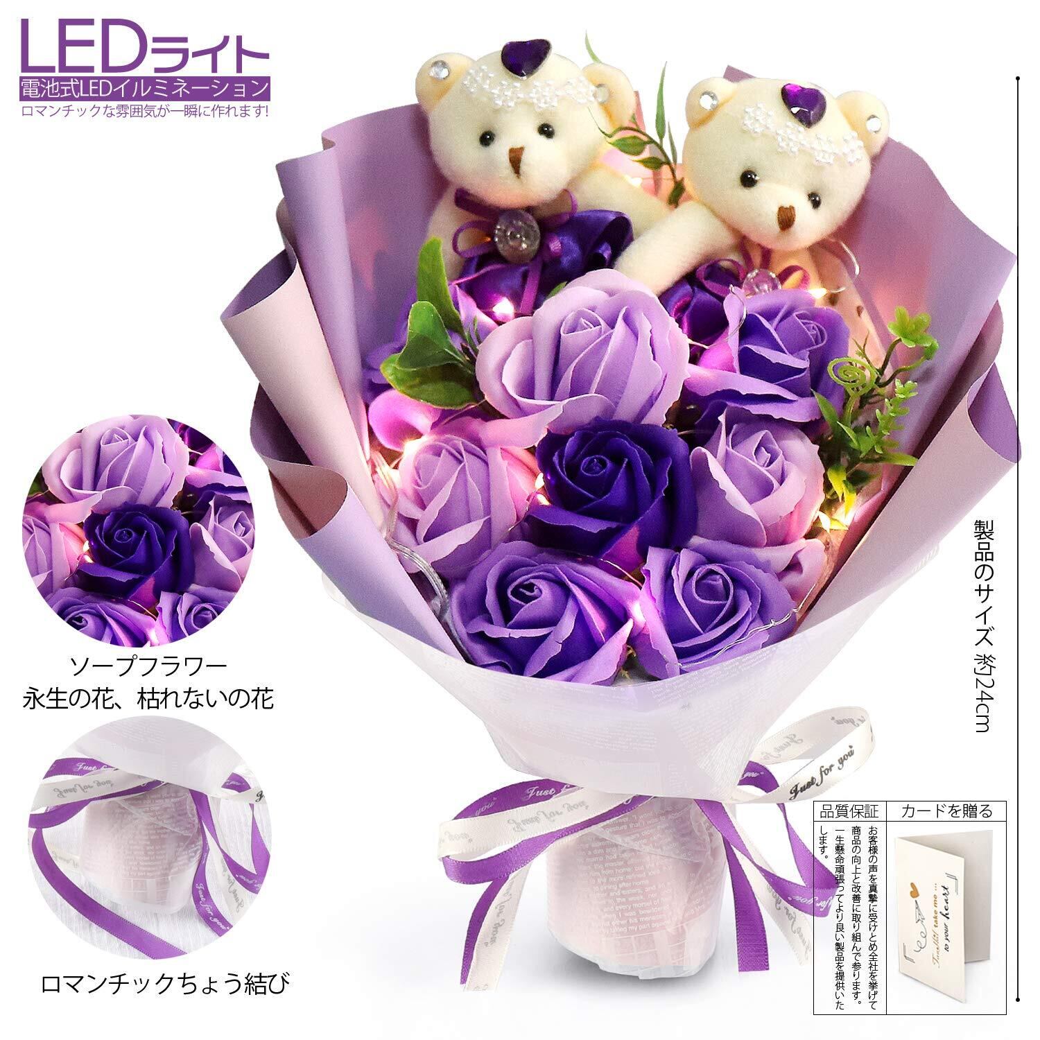 LEDつきのバラ ソープフラワー フラワー 母の日のプレゼント 花 枯れない花 石鹸花 バラ 造花 ブーケ くま束 创意プレゼント 結婚式 お盆 お礼用 お子さんに バレンタインデー 昇進 転居など最適としてのギフト メッセージカード付き(パープル)