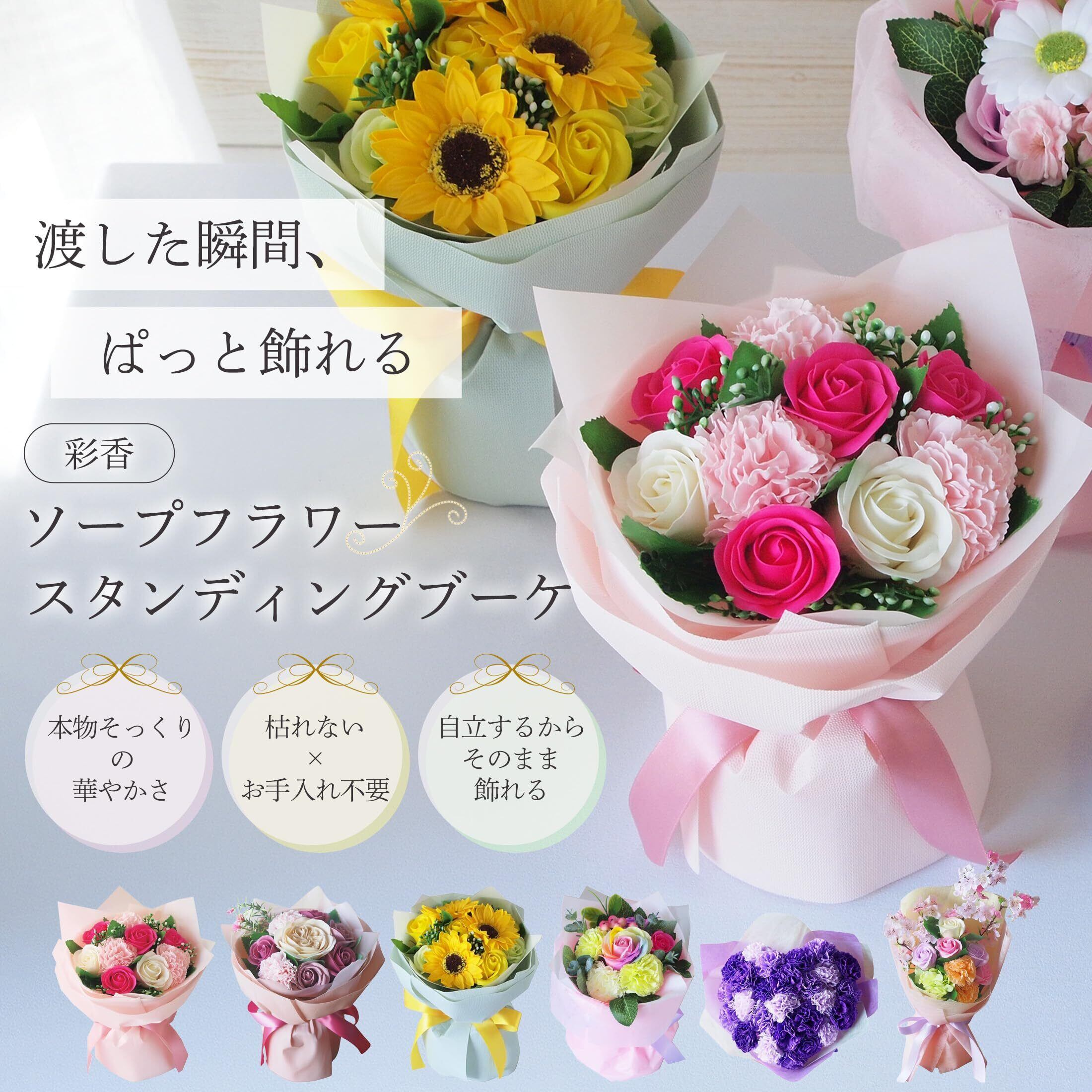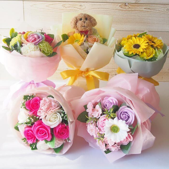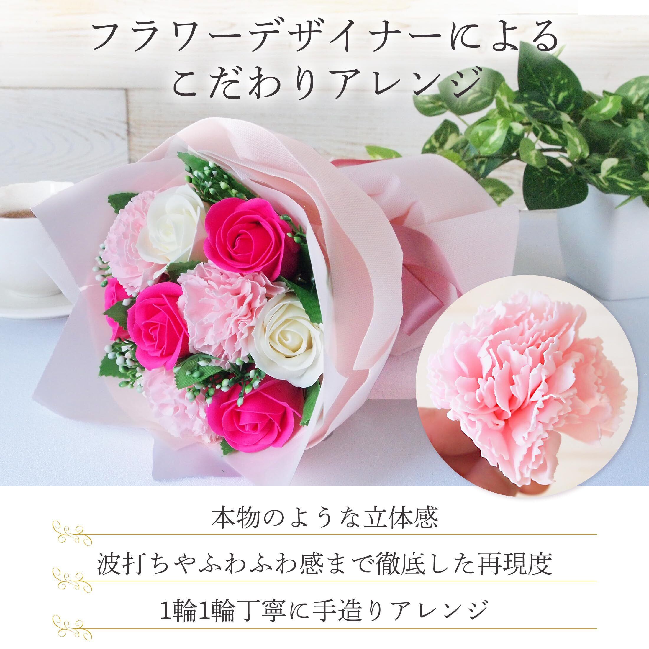 【枯れない美しさ】石鹸素材の観賞用ソープブーケは水やり不要で、長期間飾るのにも適しています。誕生日・退職祝い・仏壇用まで幅広いシーンで長く喜ばれギフトです。