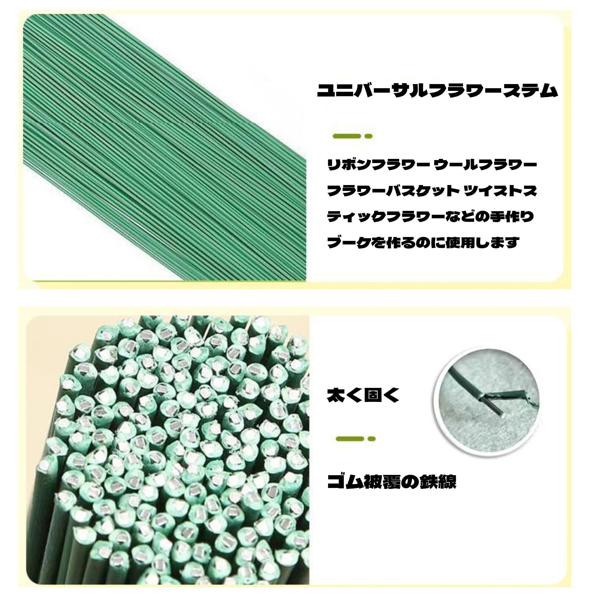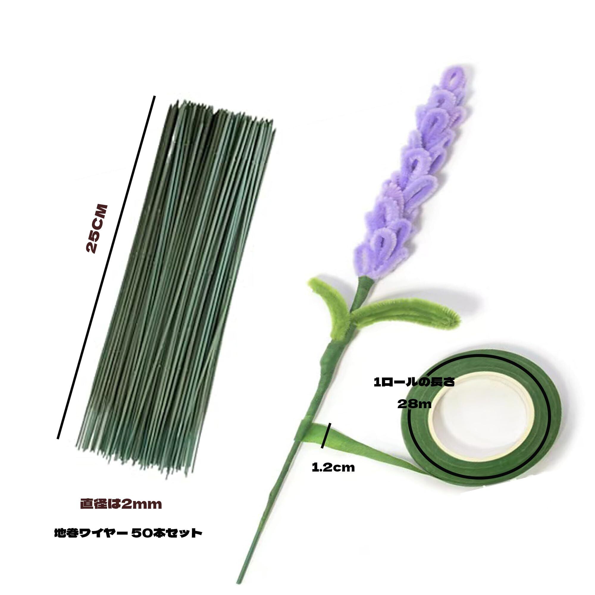 【商品サイズ】地巻ワイヤー の長さは25センチメートル 直径は2ミリメートル(芯は1ミリメートルの太さの鉄線を使用)で 強力な支え力を備えており 折れにくいです フローラルテープ の幅は約1.2センチメートル 全長は28メートルで 優れた伸縮性と粘着力があります
