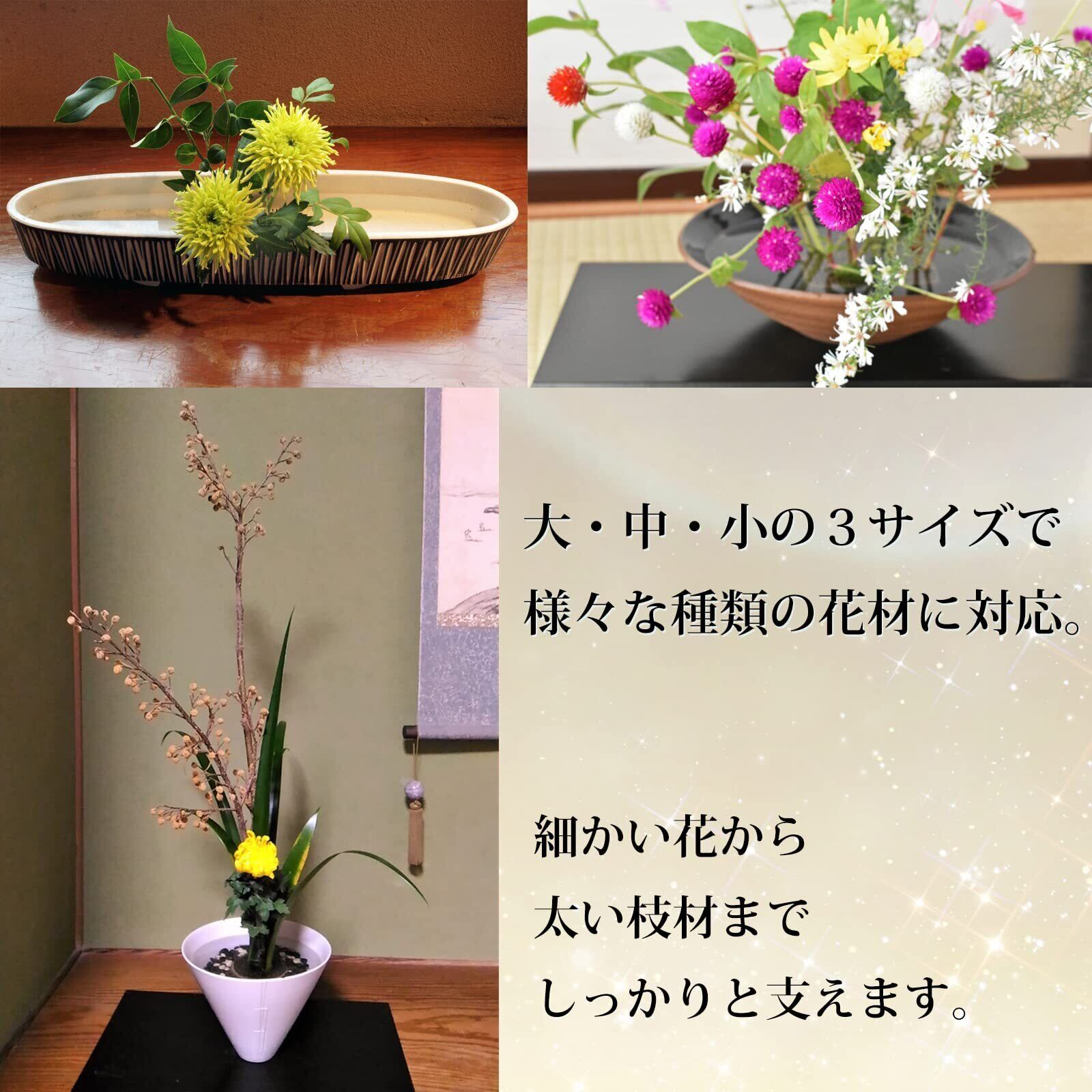 【大・中・小の3サイズセット】大・中・小の3サイズセットで様々な生け花スタイルをサポート。それぞれのサイズが異なる花材やデザインに適応し、幅広い表現が可能です。この万能な剣山セットがあれば、あなたの花道をさらに広げ、多彩な生け花作品を創り出すことができます。初心者から上級者まで、あらゆるレベルの方におすすめの剣山セットです。